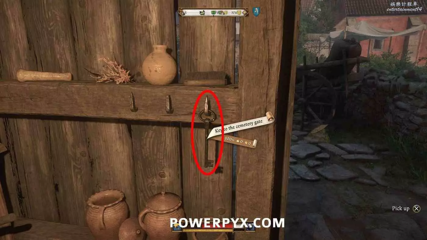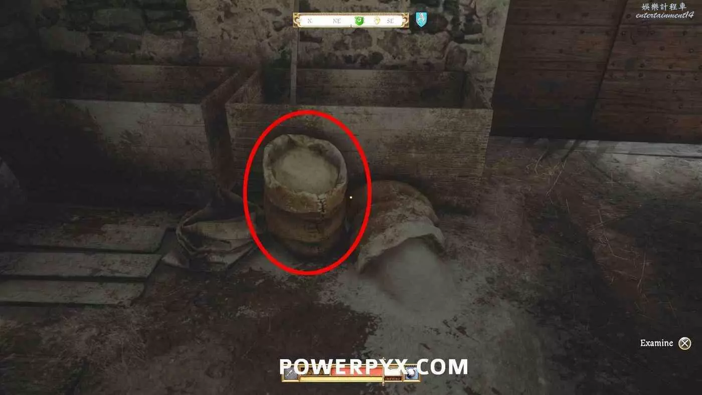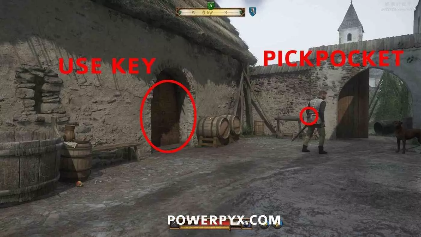 前往修道院西邊建築位置的目標A點。需要進入穀倉,但門上帶有困難難度的鎖。穀倉前有一名守衛。先存檔,然後從守衛身上偷到鑰匙,用鑰匙開門。如果被抓住就讀檔再試。裡面有兩具屍體。