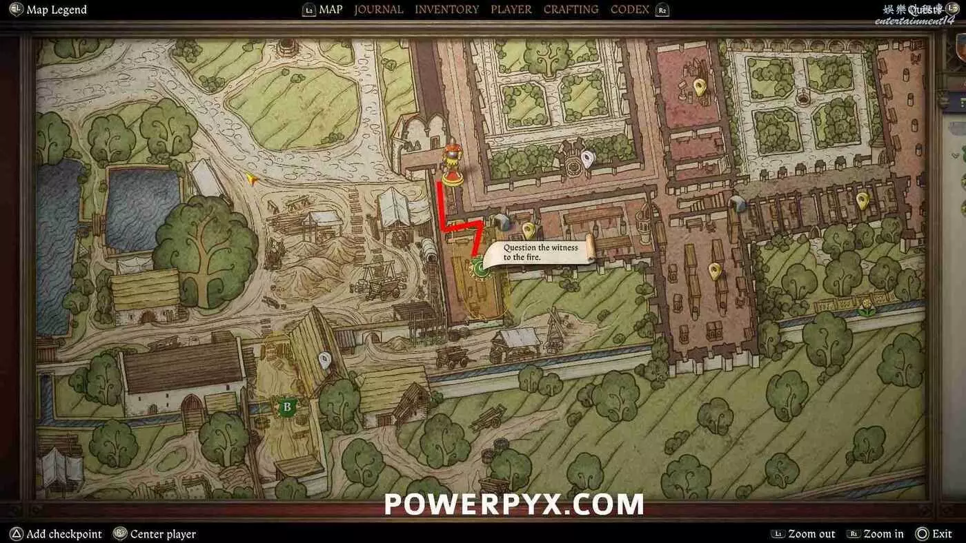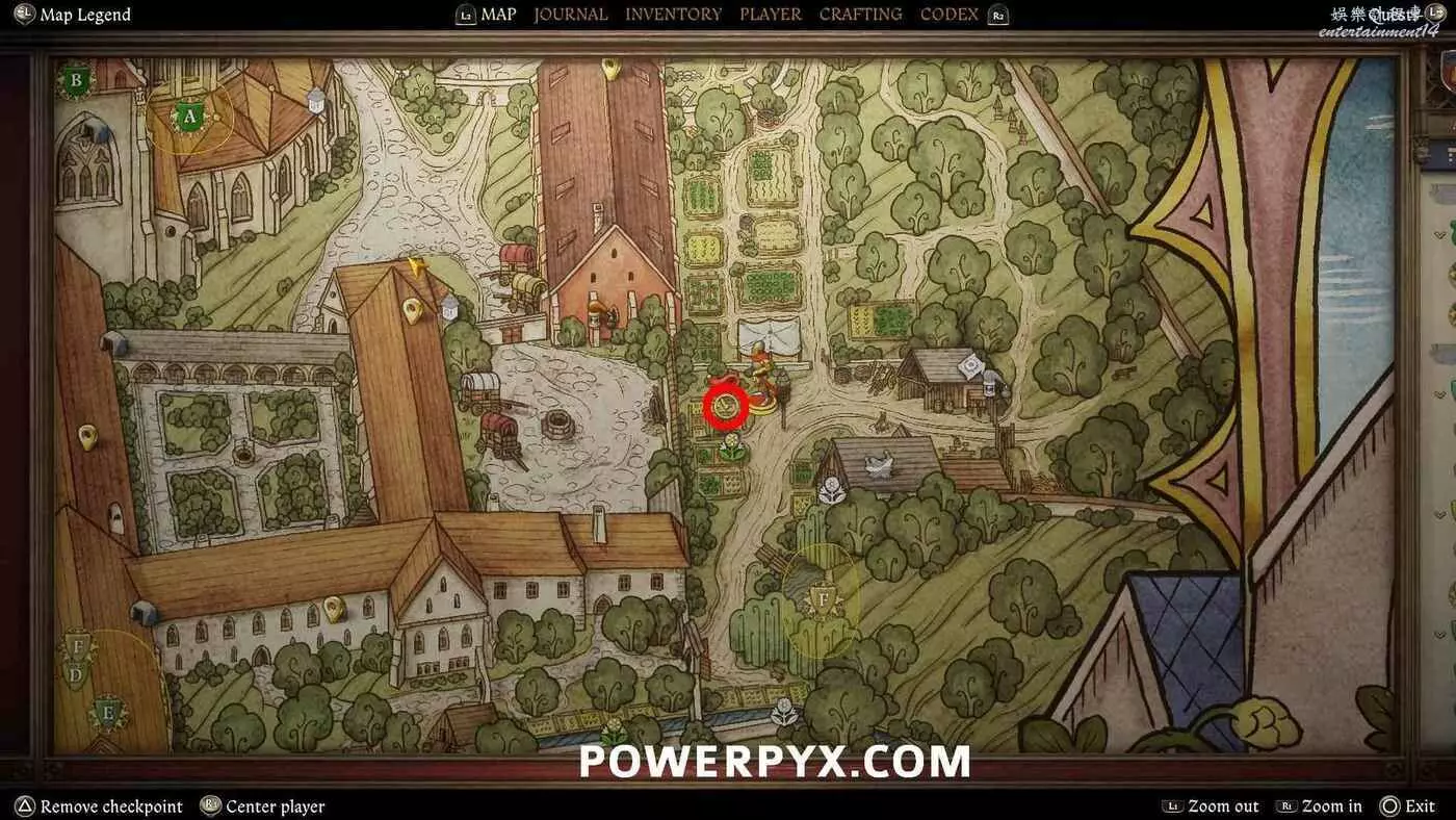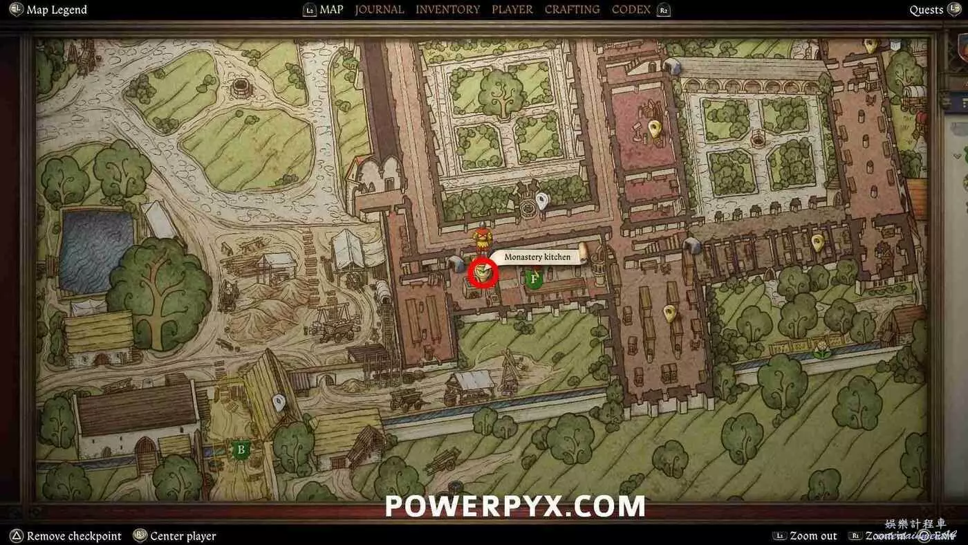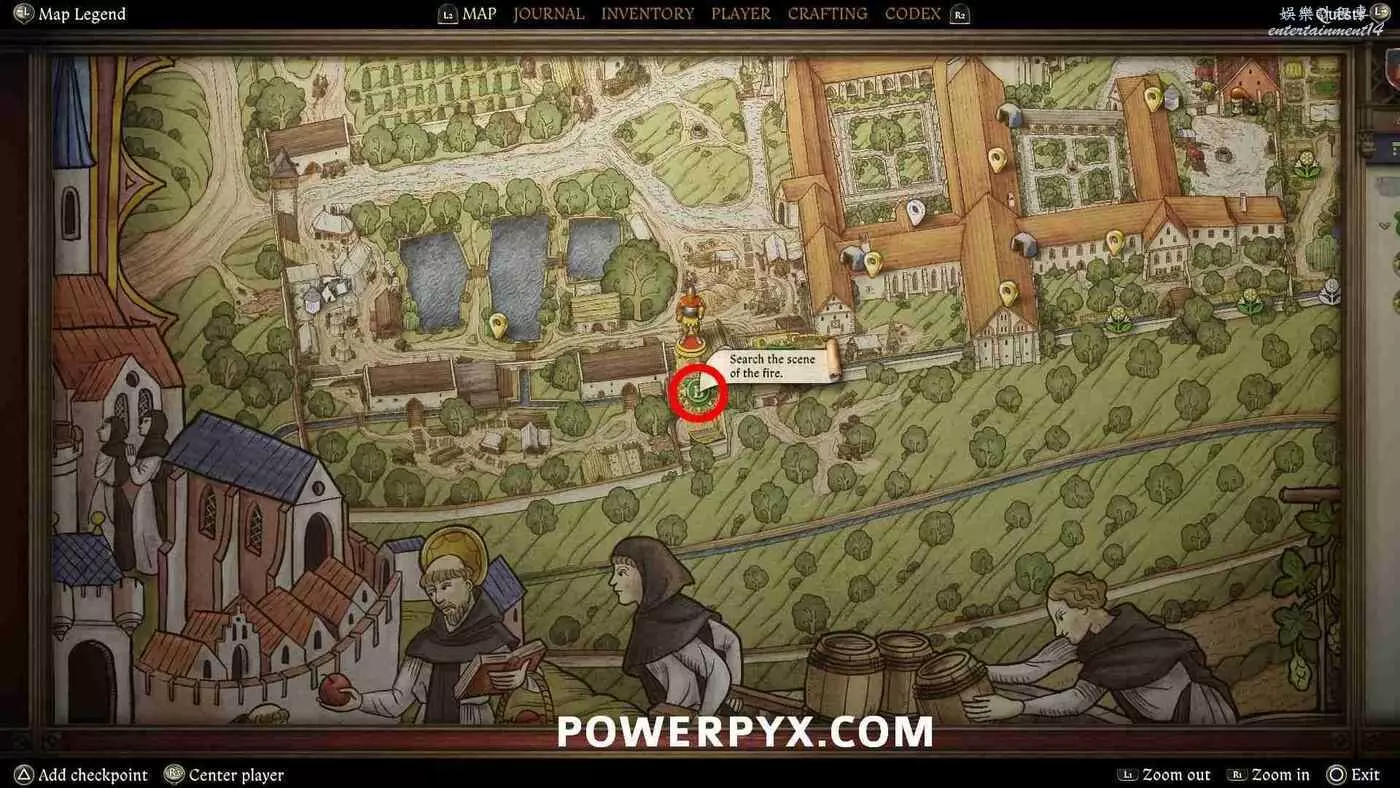 前往修道院西南邊的B標記點。從北邊靠近,進入帶有燒毀穀倉的院子。