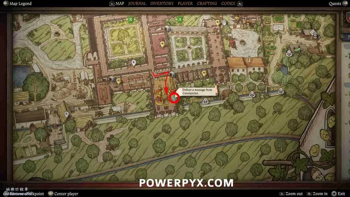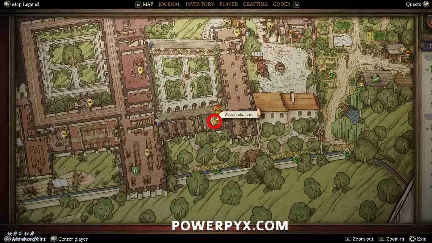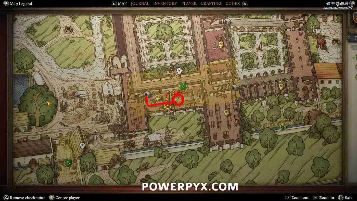 如果從斯蒂芬那裡拿到了房間鑰匙,地圖上就會顯示房間的位置標記,可以中間庭院進入,位於庭院的東南角。