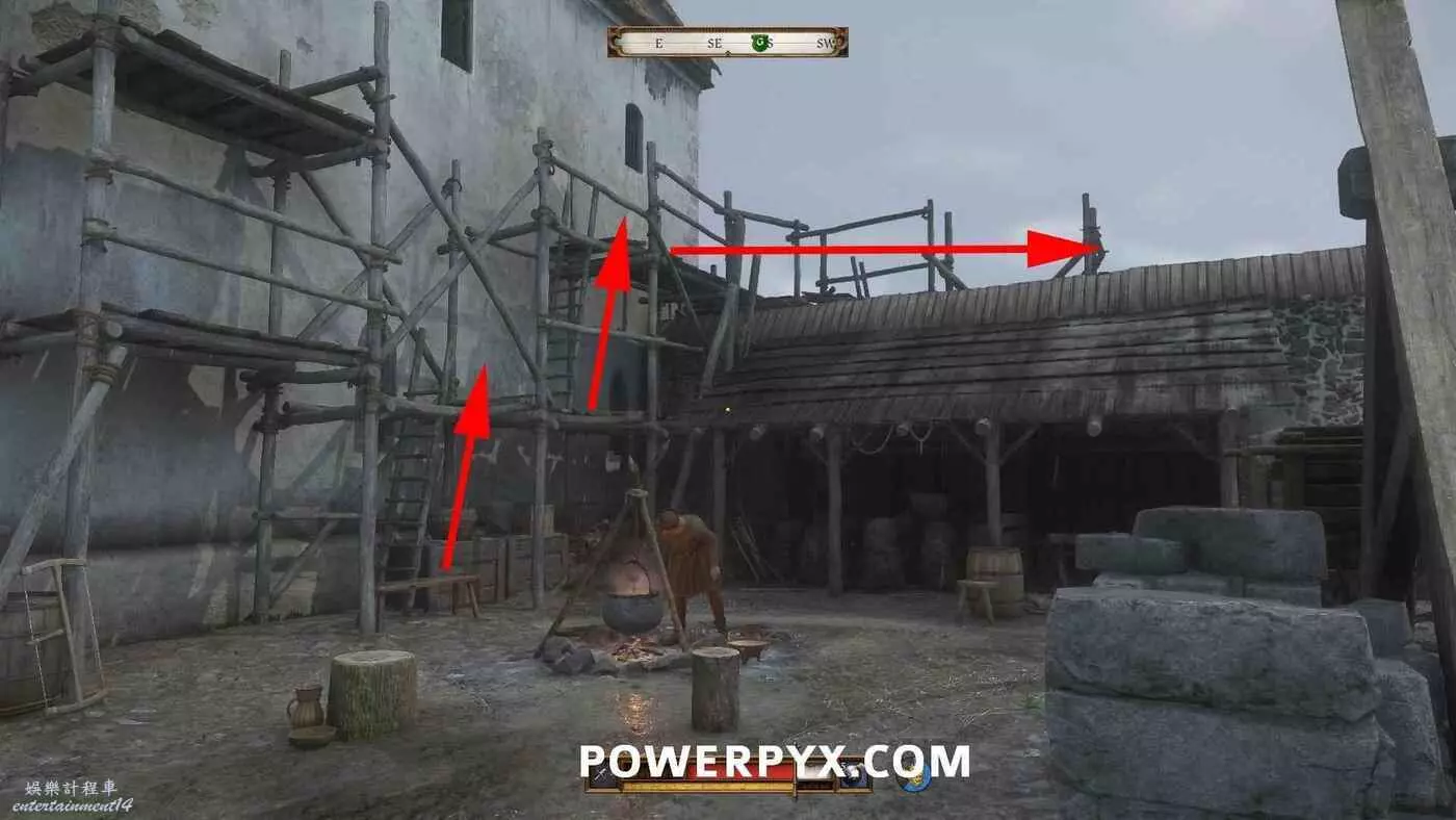 然後可以爬上棚屋從另一邊跳下來,或者撬開大門。