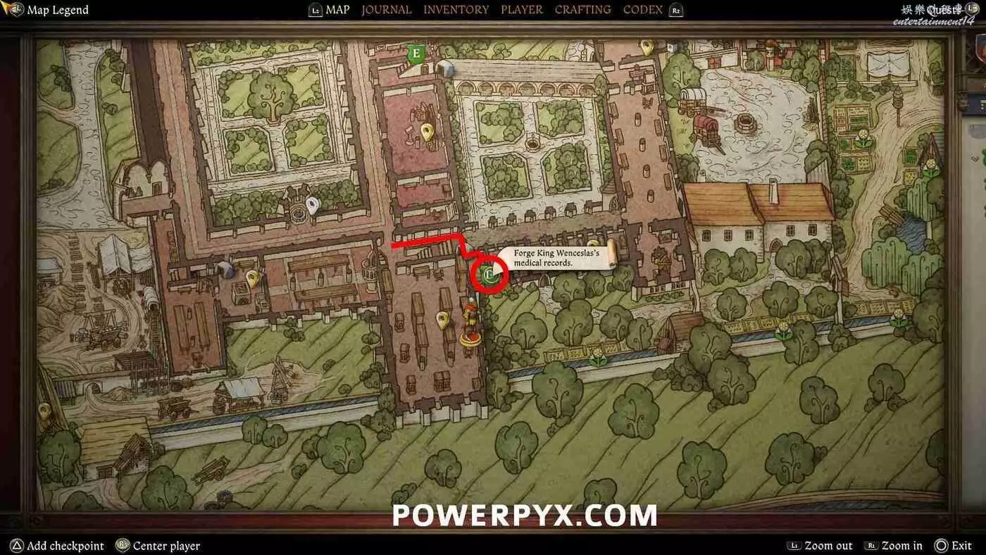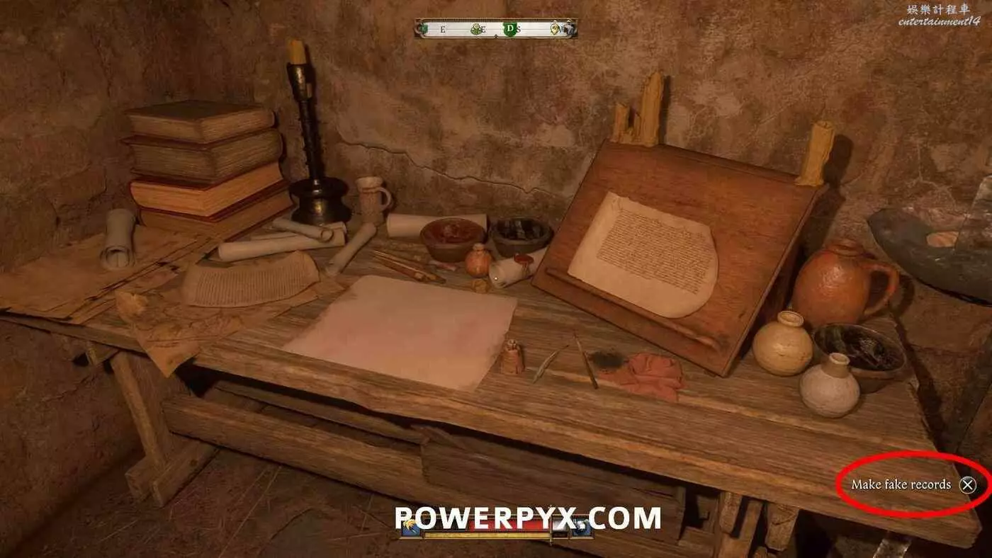 離開圖書館,右轉下樓梯進入地窖。在樓梯底部右轉爬過架子,重新進入在第二個任務【追本溯源】中解鎖的隱藏繕寫室,就是講笑話的修士所在的地方。與桌子互動來製作偽造記錄。需要先在打開【物品欄-書籍-瓦茨拉夫國王的病歷】閱讀所有書頁。