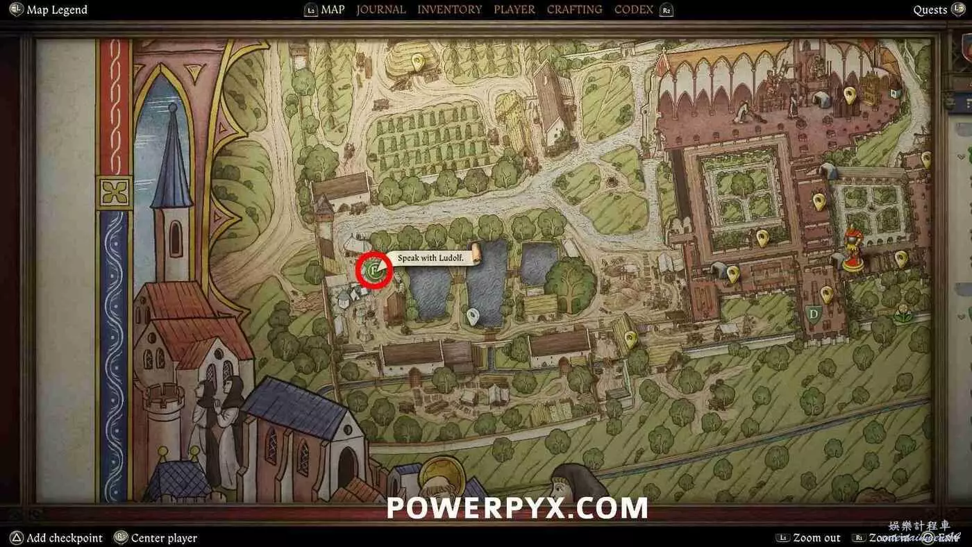 如果與院長對話時成功通過了技能檢定並且獲得了聖物,會觸發此目標。魯道夫是守衛隊長,地圖上會顯示他的位置標記,他通常會在士兵營地和修道院之間的區域巡邏。與魯道夫對話沒有選項,可以自動獲得一件盔甲。