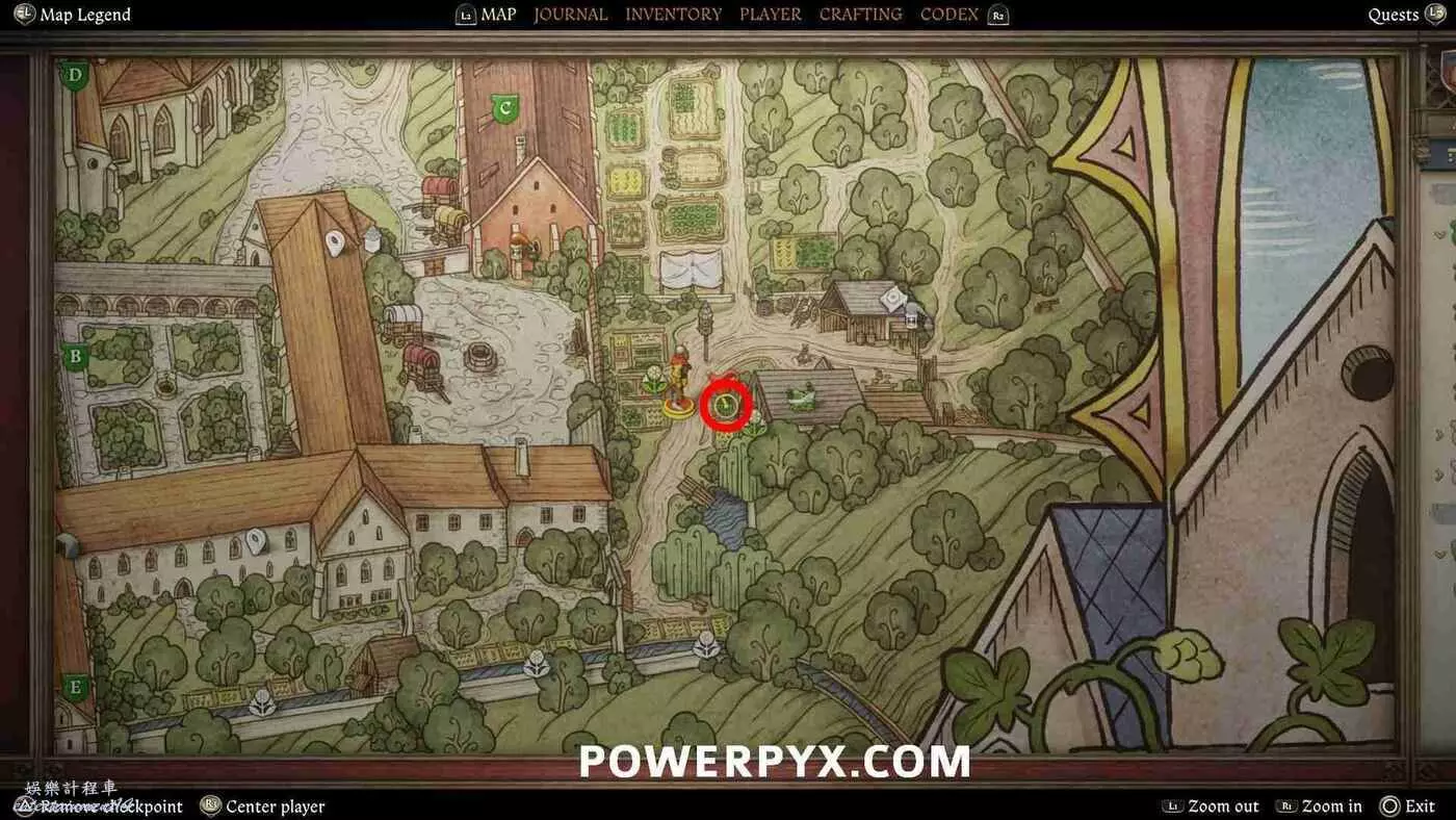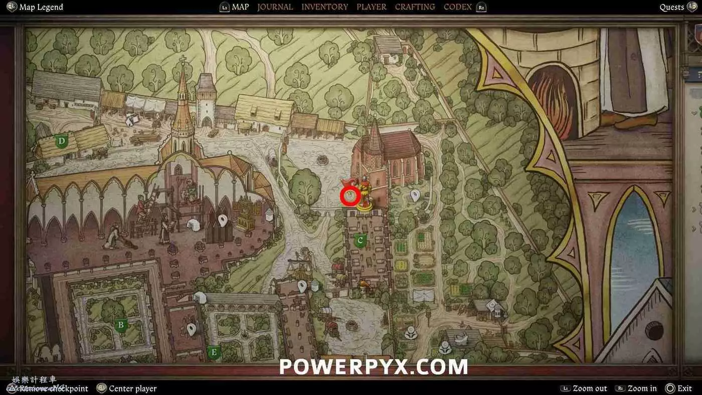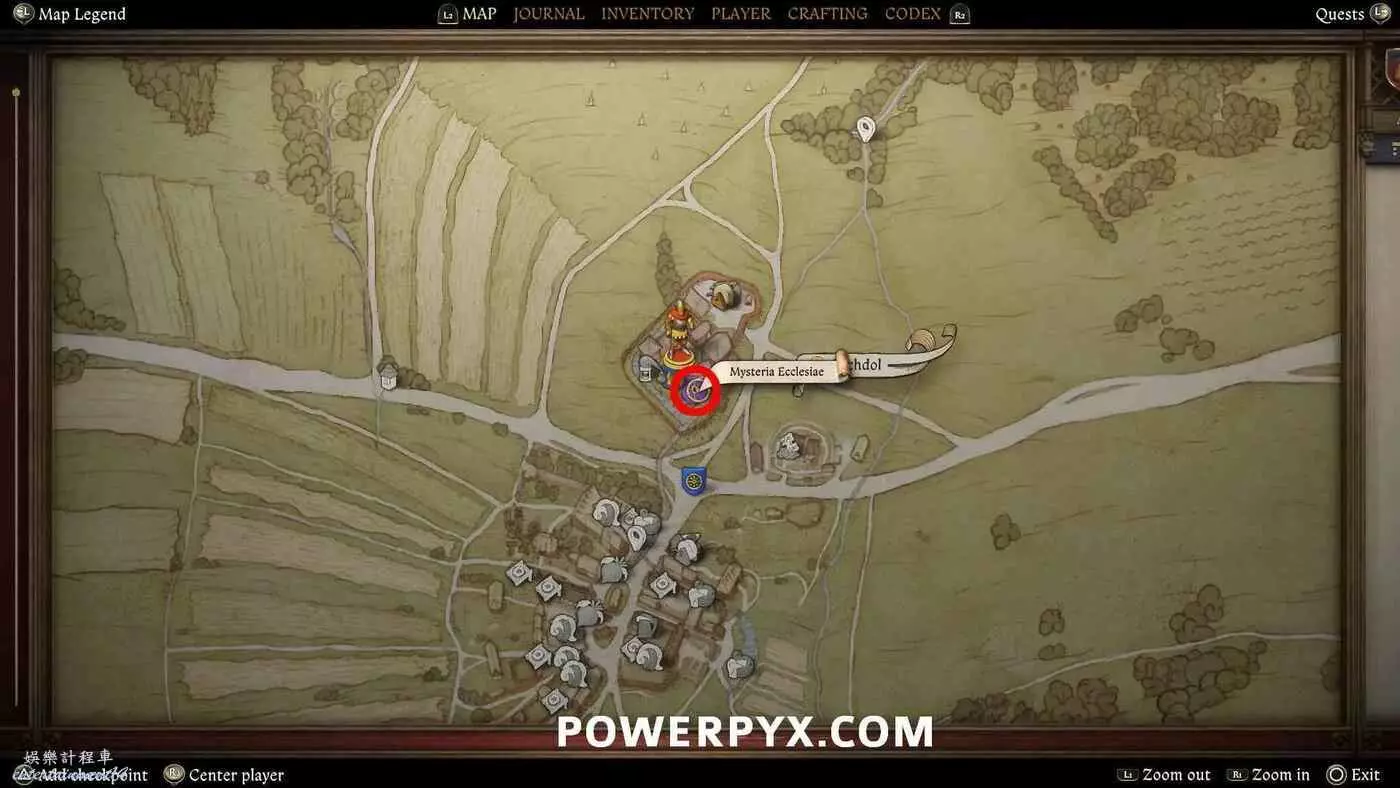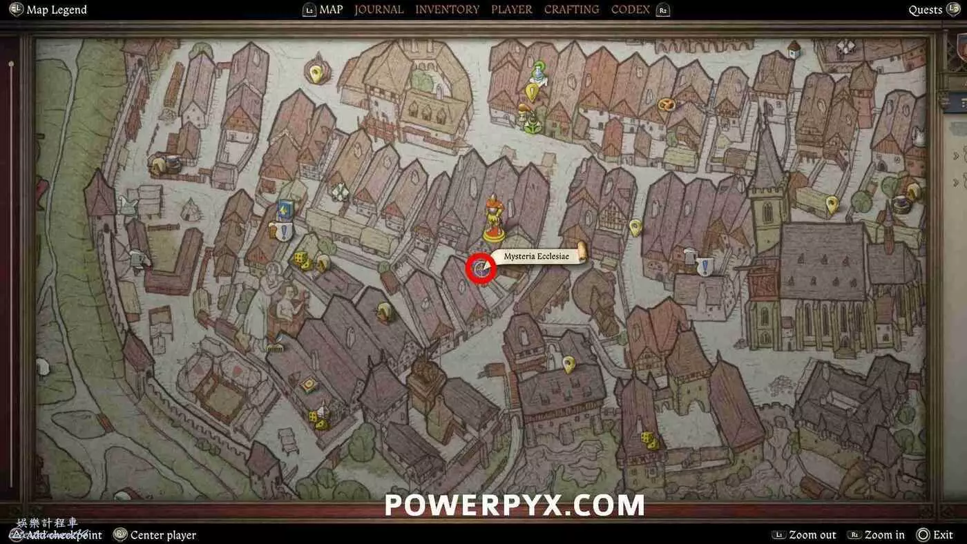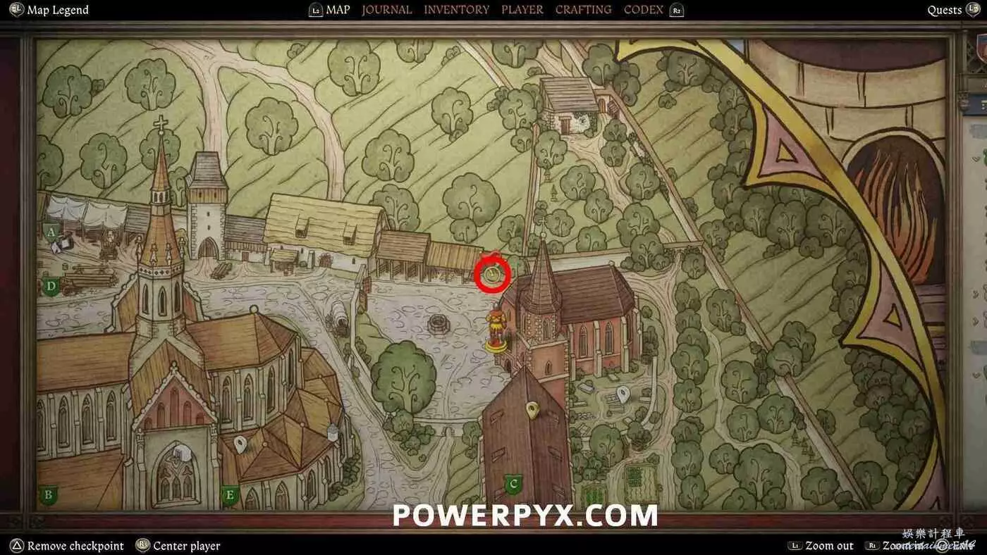 打開地圖並完全放大。在醫務室的正西方向可以看到【院長的小堂】,地圖上以一個手持天平的天使標記顯示,這裡就是目標位置。
