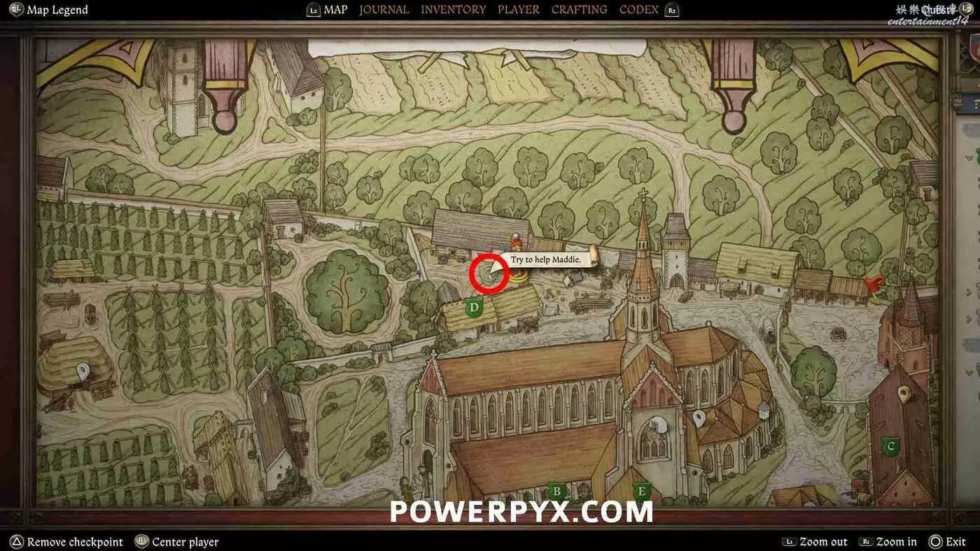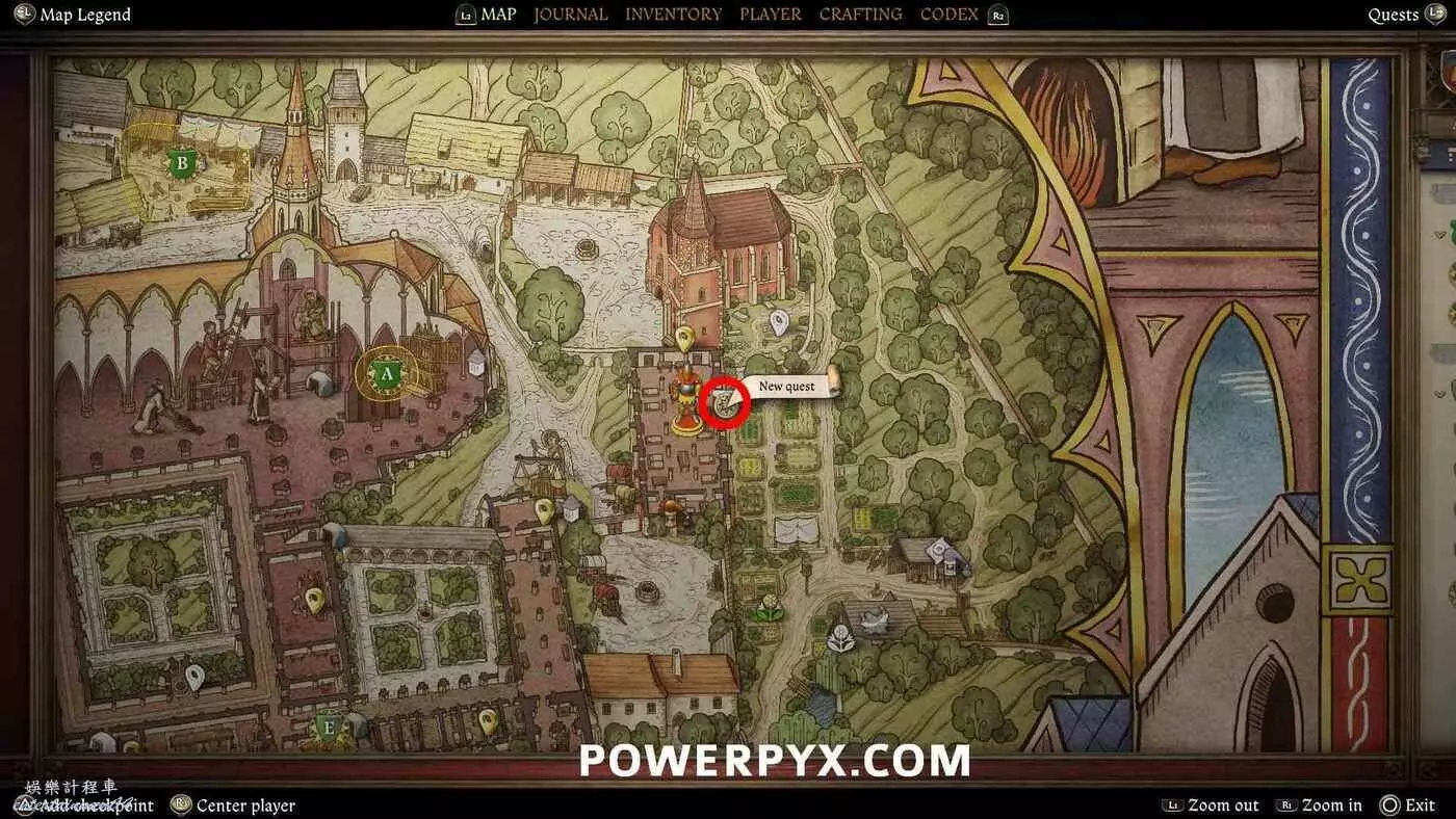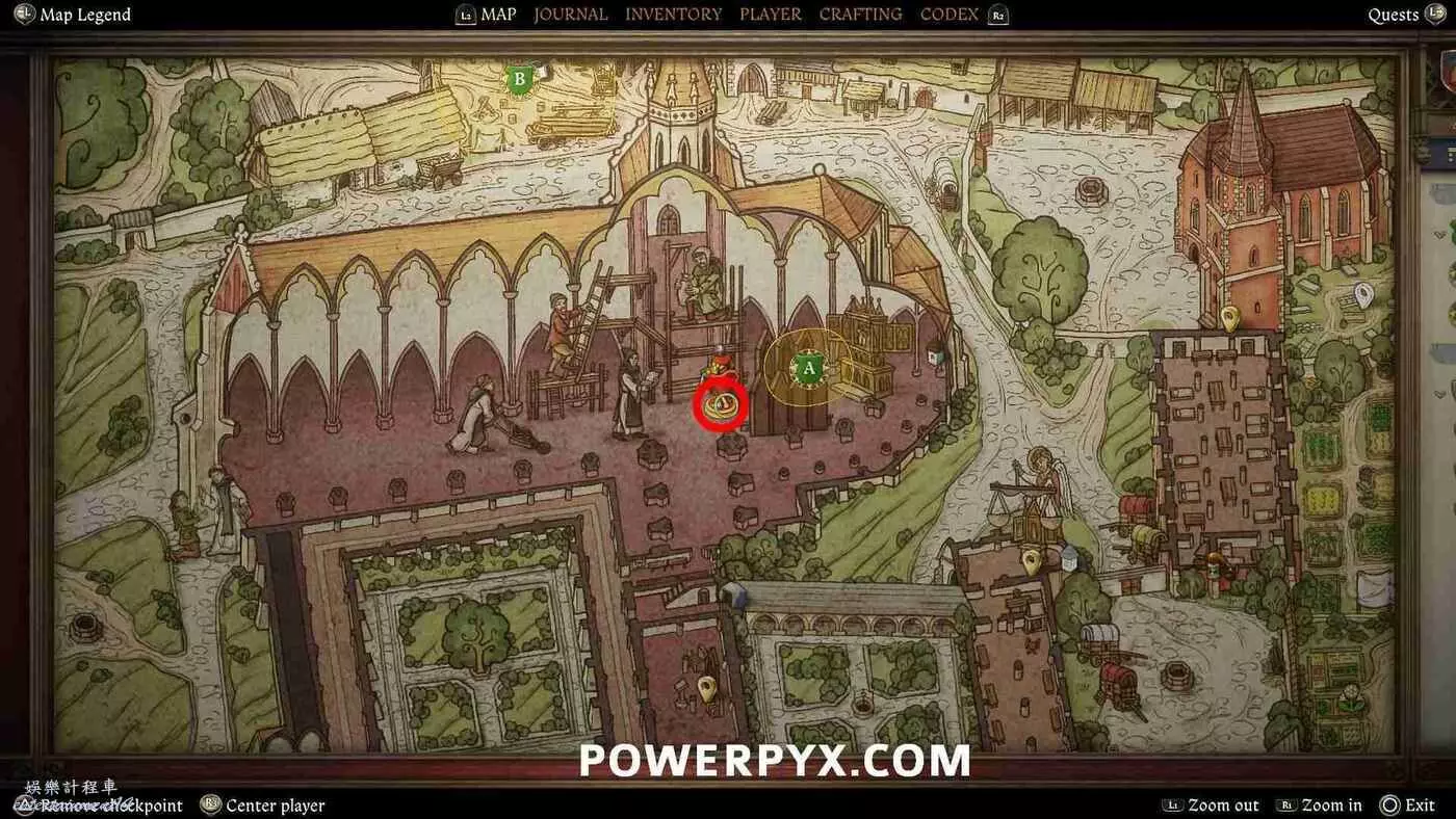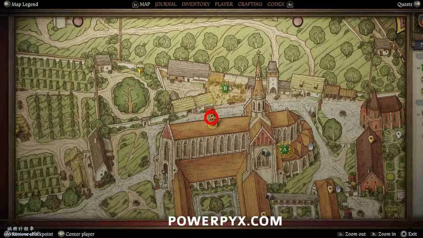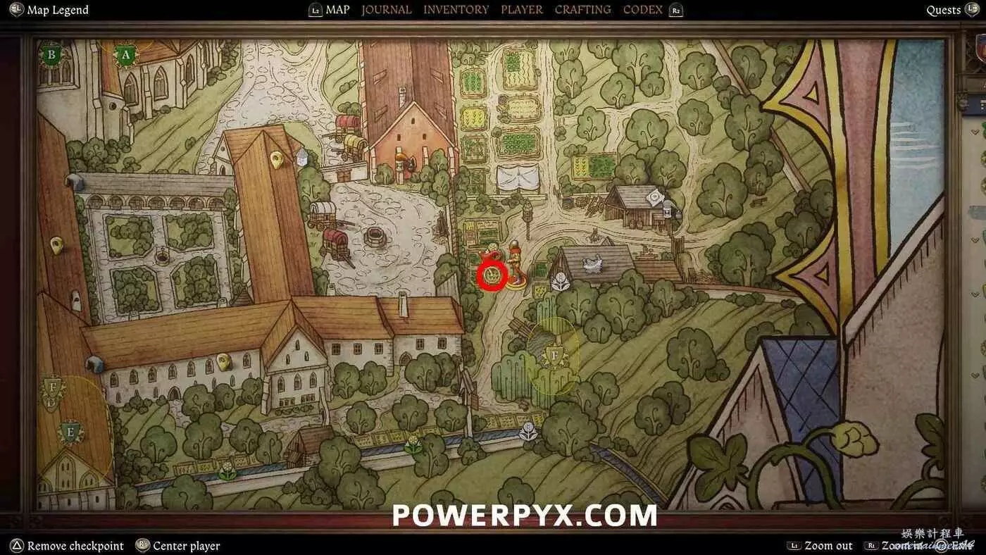 打開地圖並完全放大。在醫務室的正西方向可以看到【院長的小堂】,地圖上以一個手持天平的天使標記顯示,這裡就是目標位置。