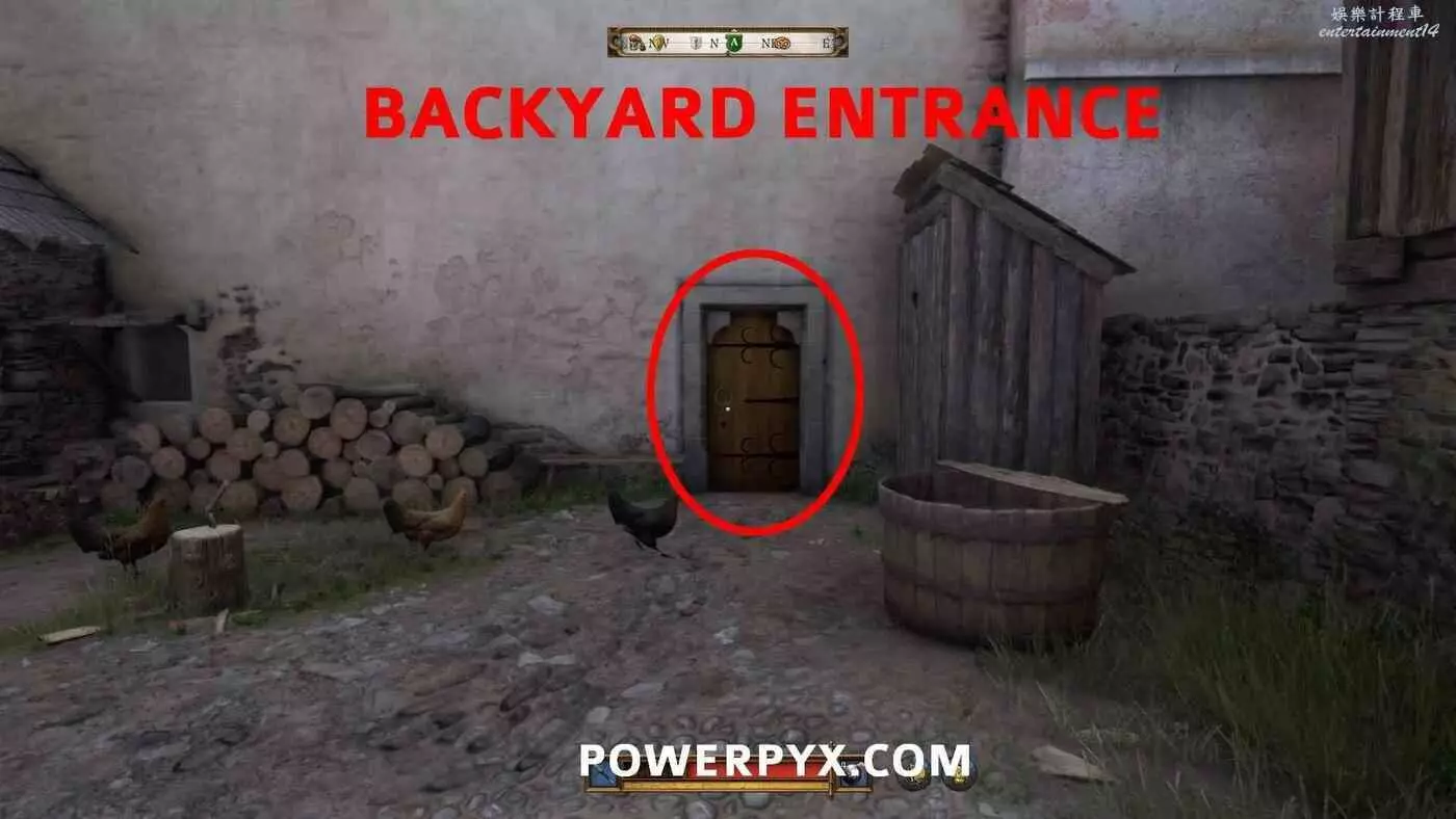 調查之後地圖標記會更新到房子後門入口。從南邊的街道前往,通過後院進入門內。
