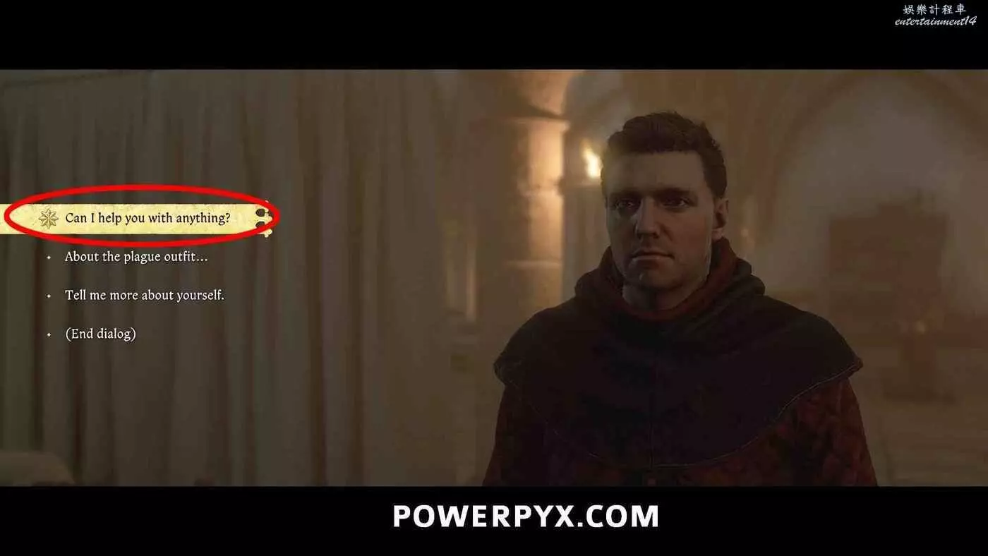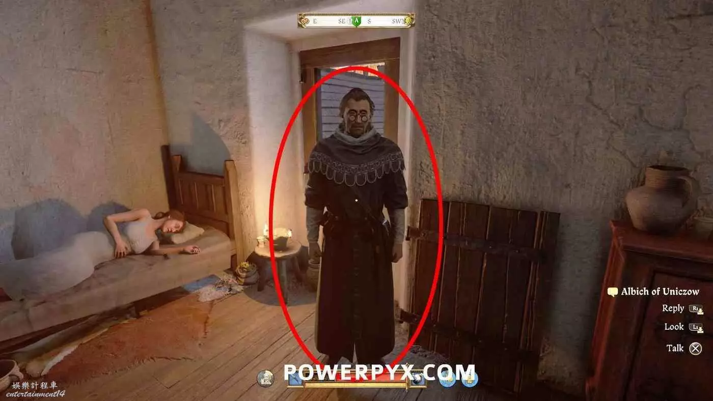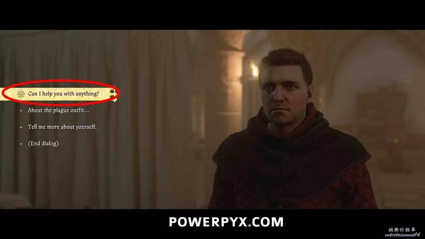 之後跟隨佩特羅米爾參觀修道院,按下【L1/LB/ALT】自動跟隨,走一圈之後他會帶亨利來到阿爾比赫等候的醫務室,在參觀過程中可以隨意提問,選擇任意選項。
