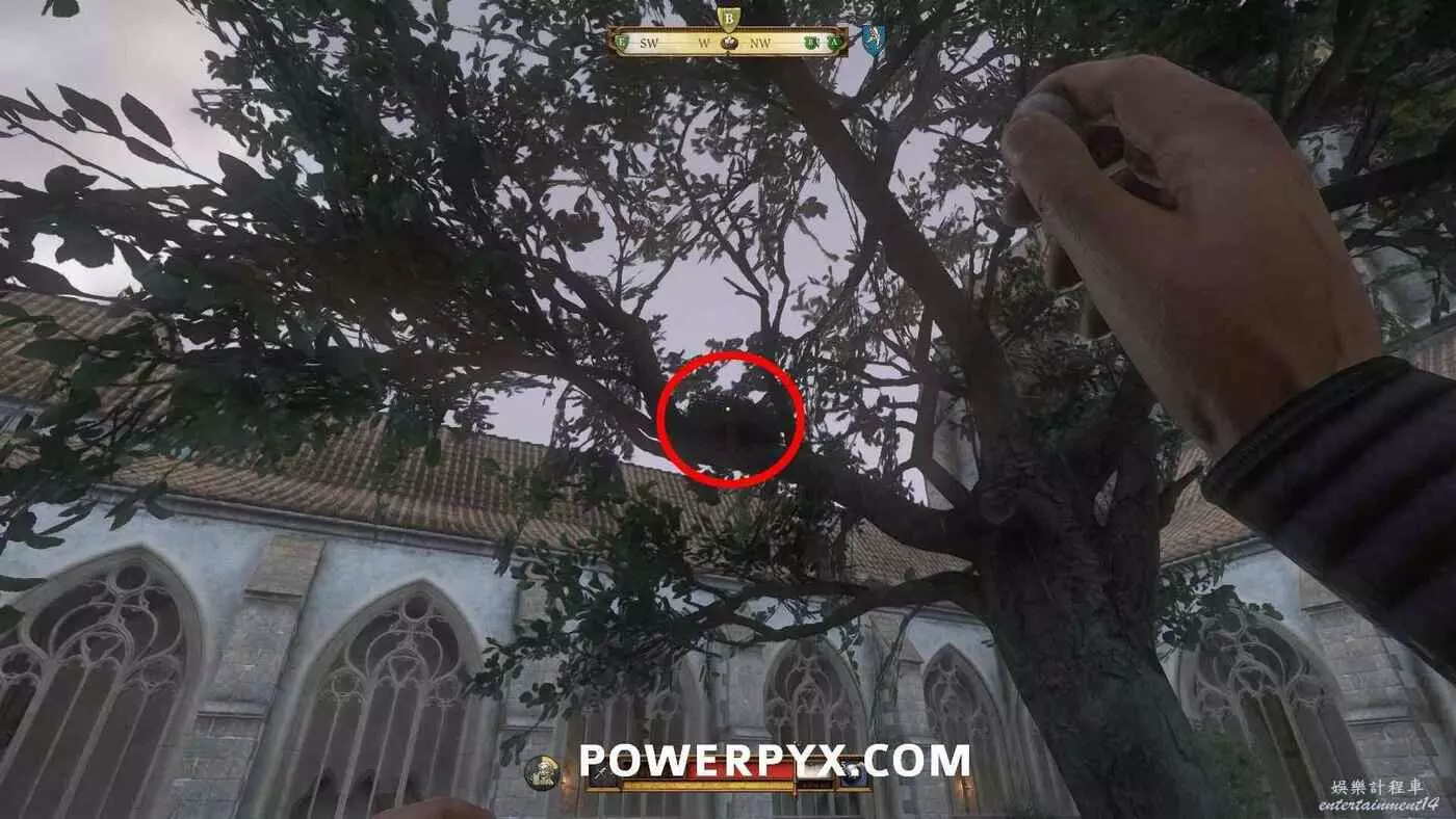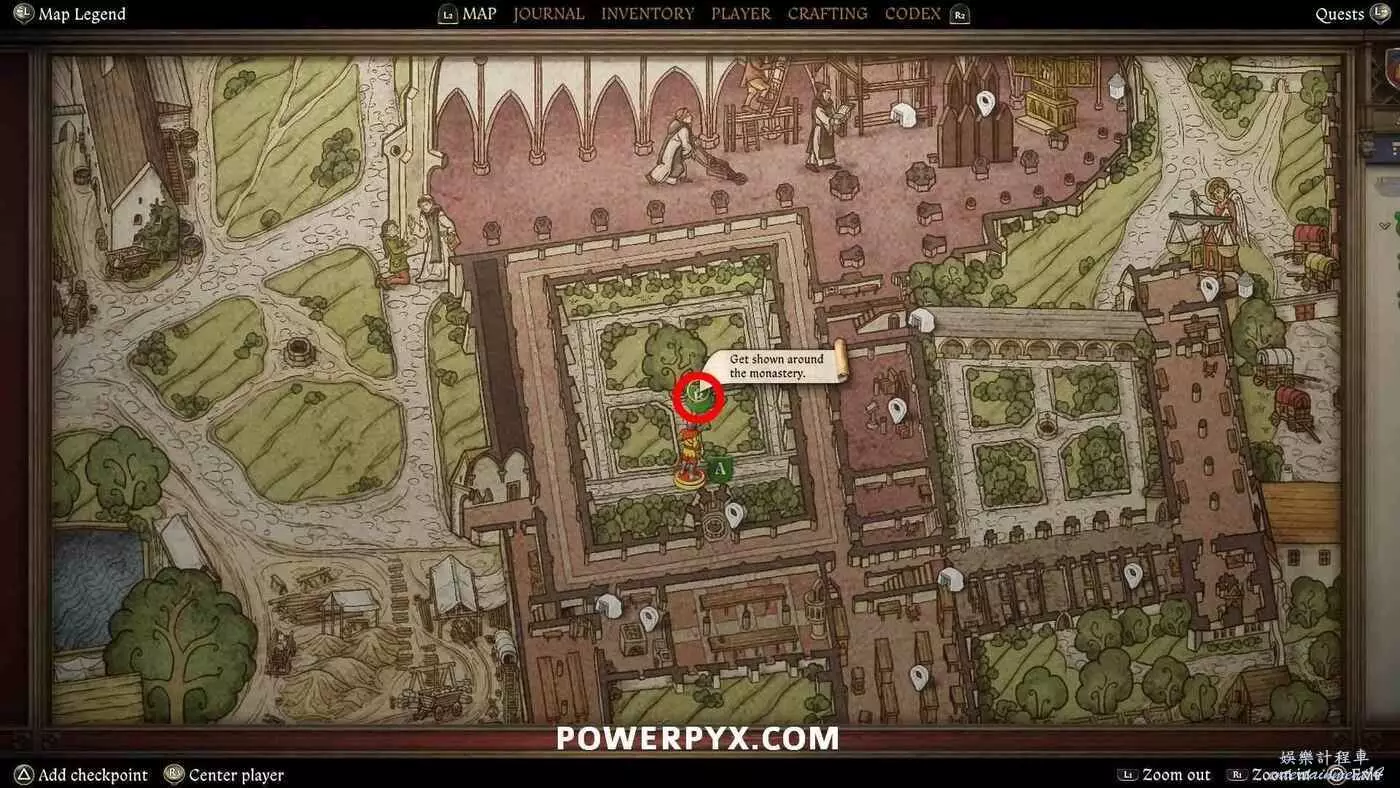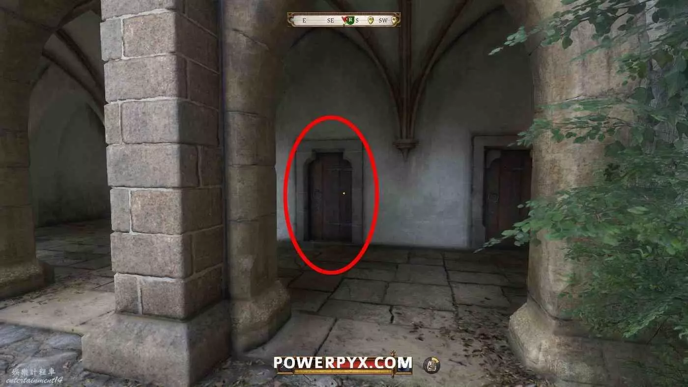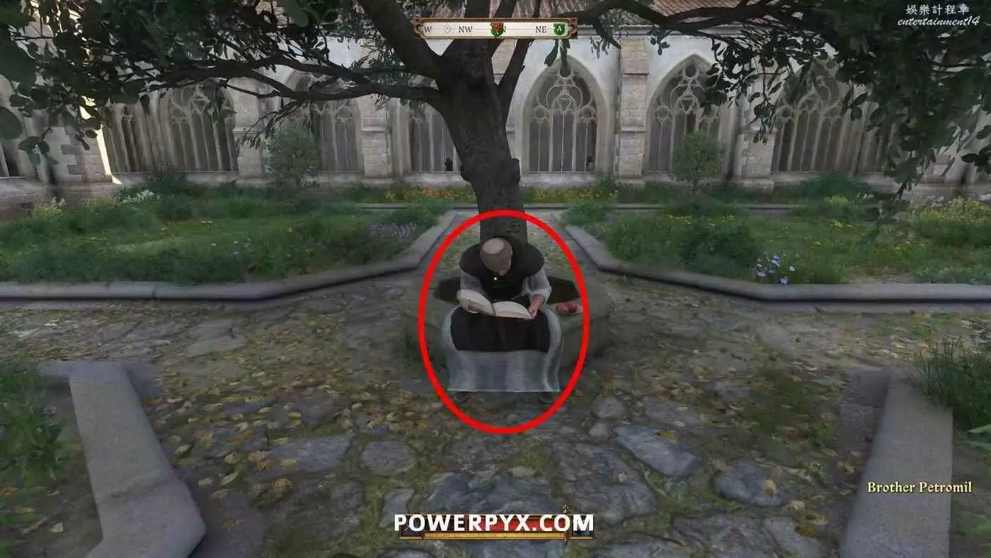 與起始位置庭院中大樹下的佩特羅米爾修士交談,選擇【你能帶我參觀修道院嗎?】→【請吧】。