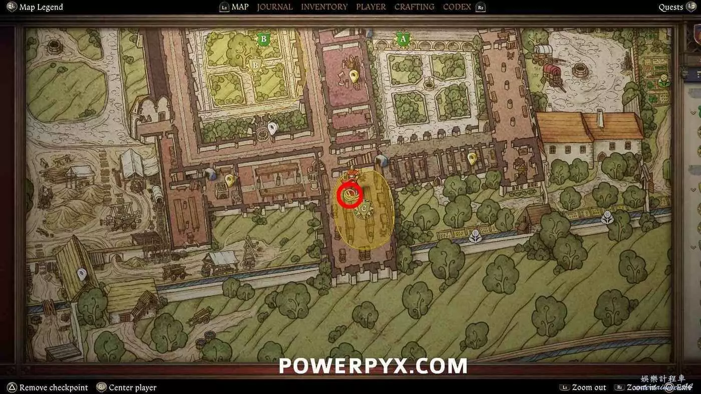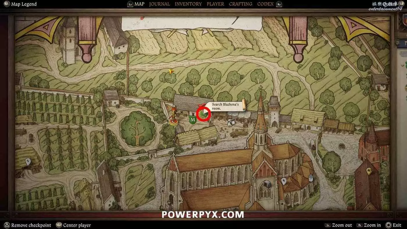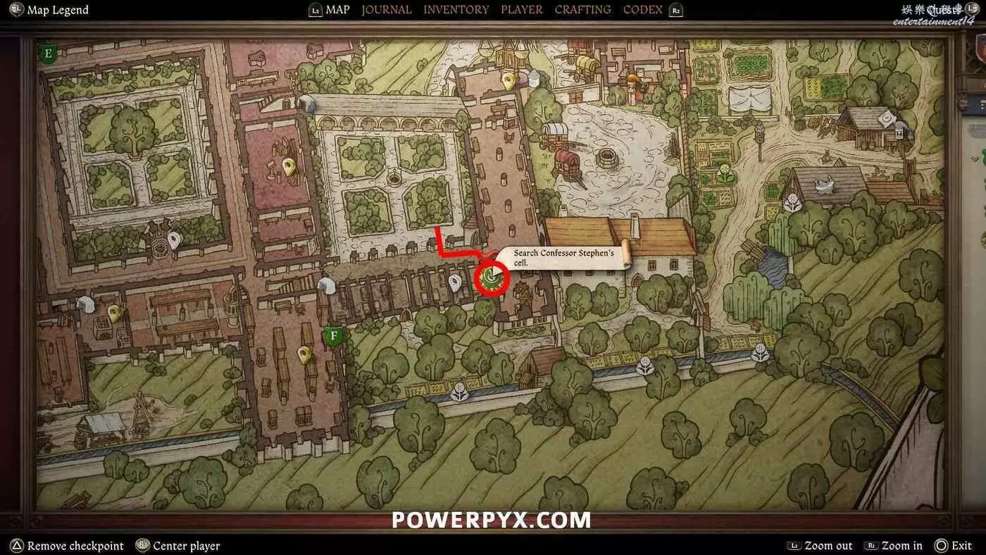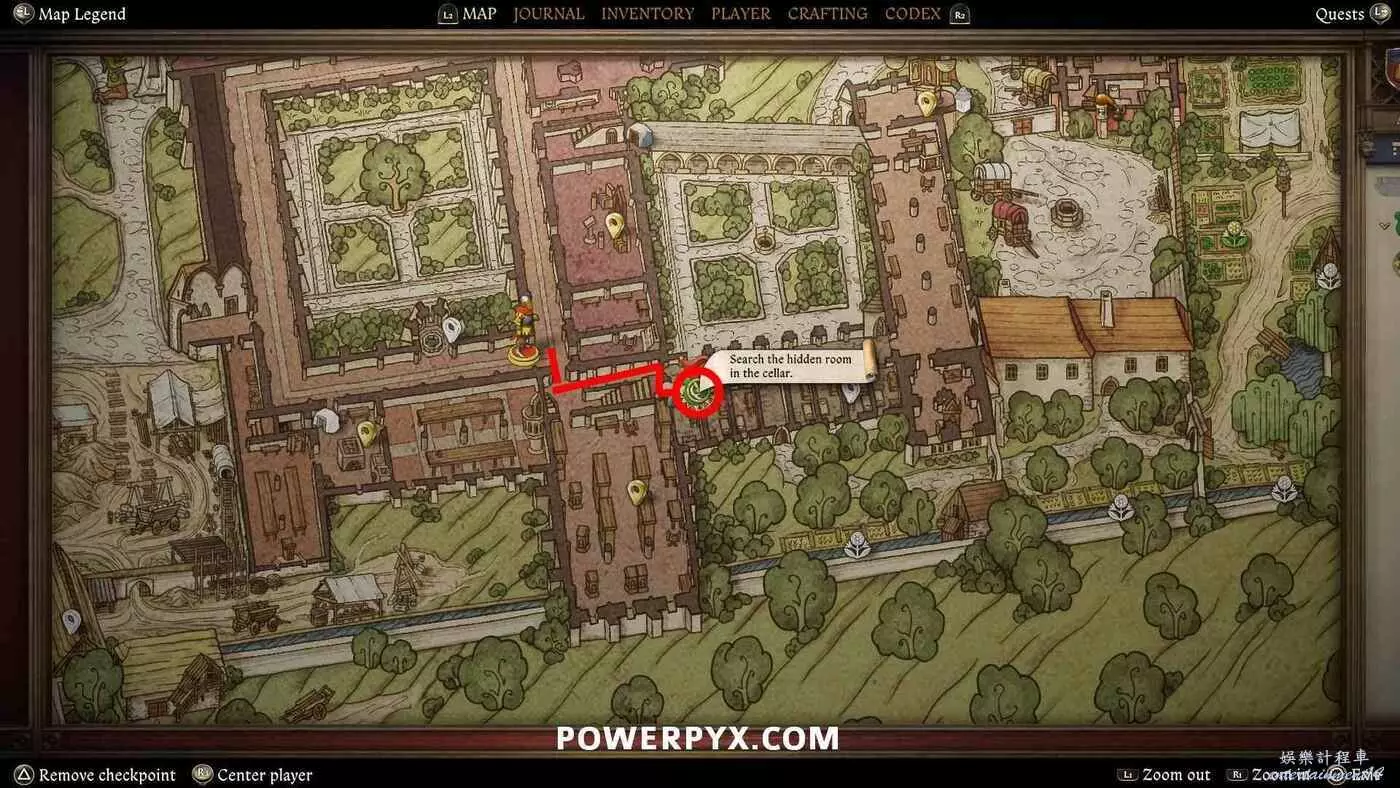如果從斯蒂芬那裡拿到了房間鑰匙,地圖上就會顯示房間的位置標記,可以中間庭院進入,位於庭院的東南角。