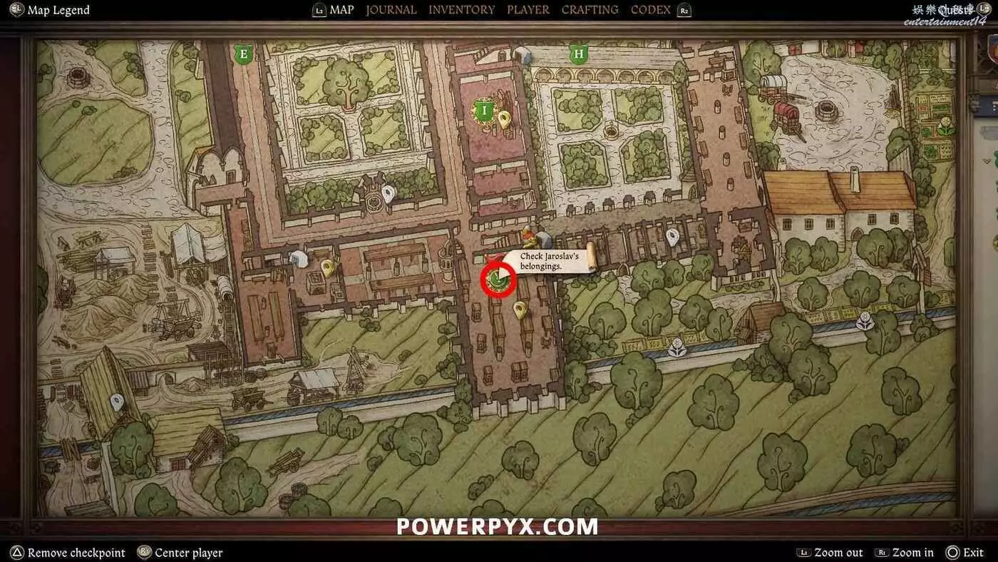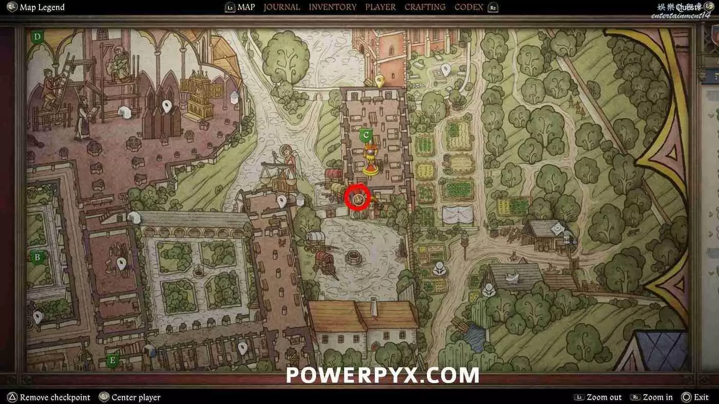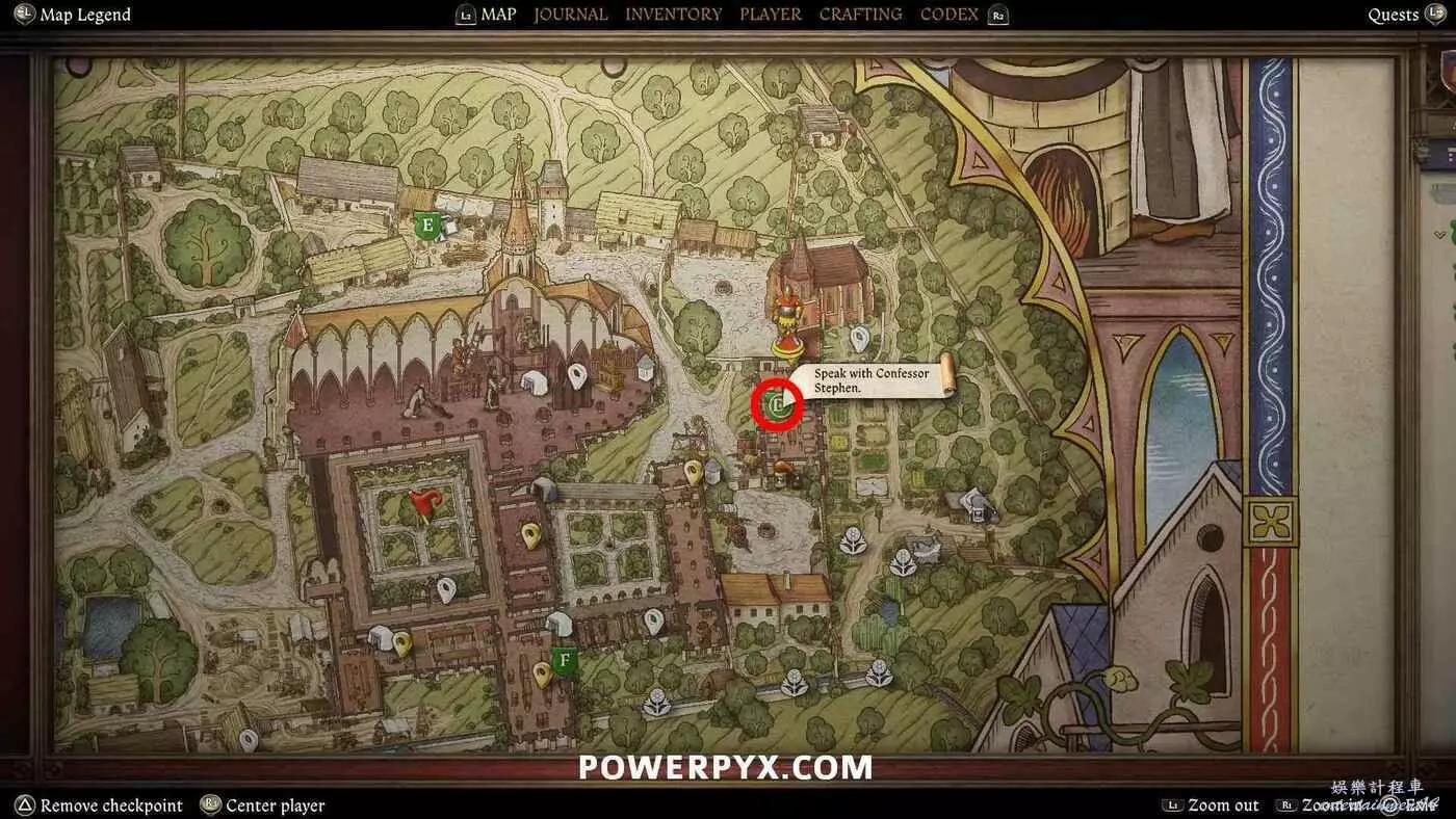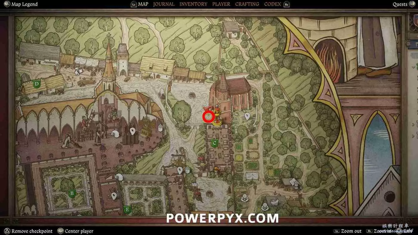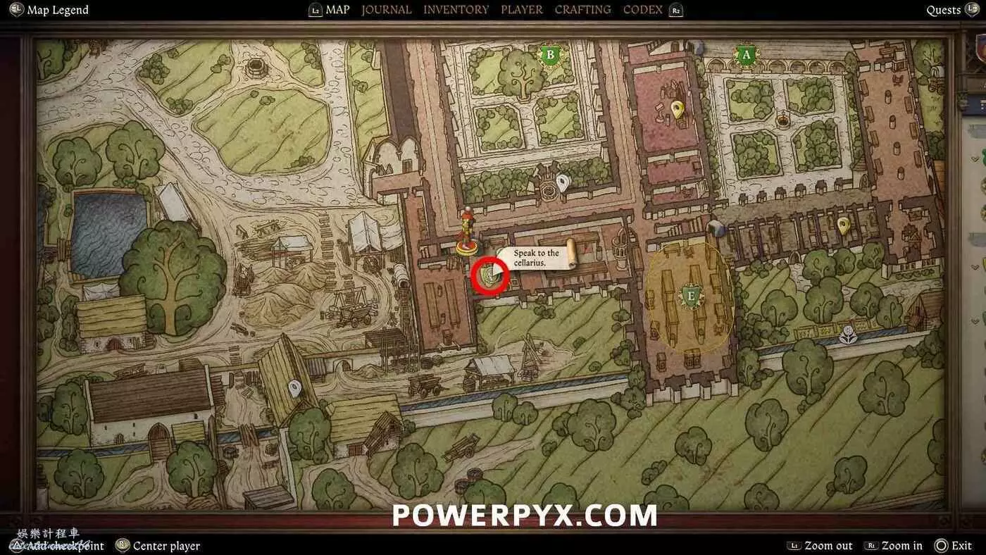 如果從斯蒂芬那裡拿到了房間鑰匙,地圖上就會顯示房間的位置標記,可以中間庭院進入,位於庭院的東南角。