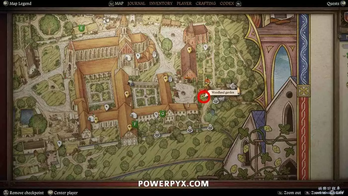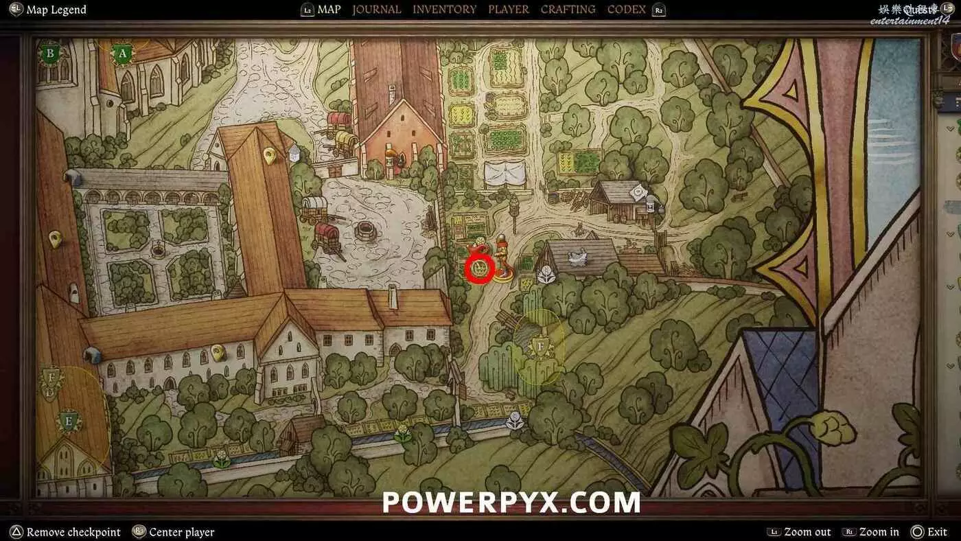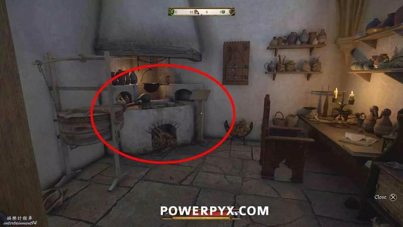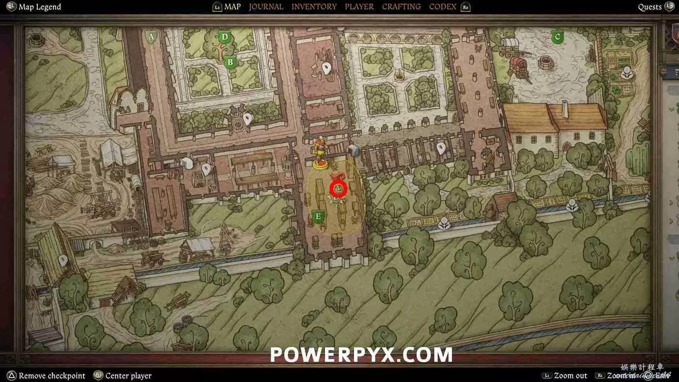 如果從斯蒂芬那裡拿到了房間鑰匙,地圖上就會顯示房間的位置標記,可以中間庭院進入,位於庭院的東南角。