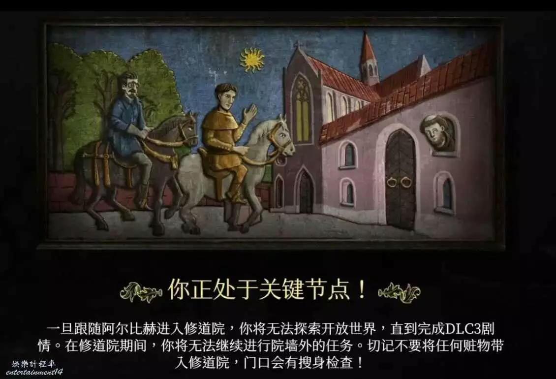 選擇【馬上出發】或之後在藥劑師家找到阿爾比赫前往修道院之後,就會被鎖在賽德萊茨修道院地圖內,直到完成整個DLC劇情才能離開,在完成DLC之前將無法返回開放世界。之後可以繼續完成其他任務。在提示介面會提醒不要攜帶任何偷竊物品,但實際上即使帶了也沒有問題,守衛不會搜查。建議儲備一些【救世幹酒】(可從酒館購買),以便可以在每個DLC任務開始時保留一個手動存檔,方便解鎖獎盃/成就。
