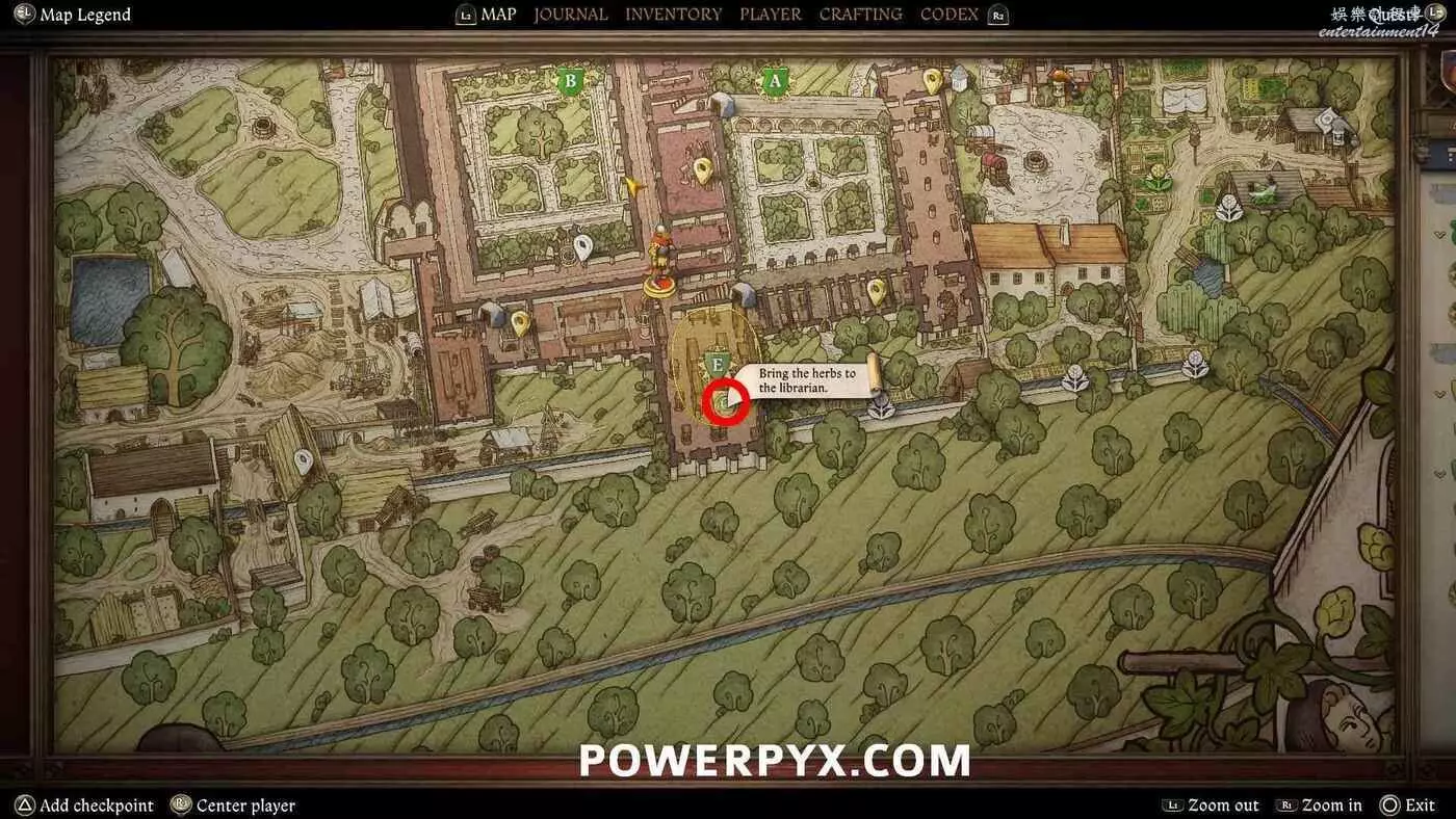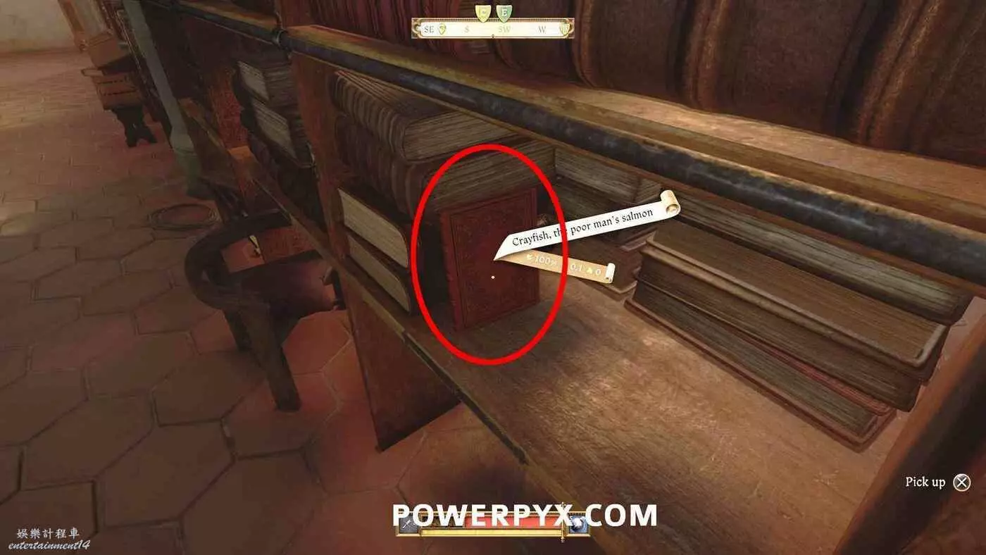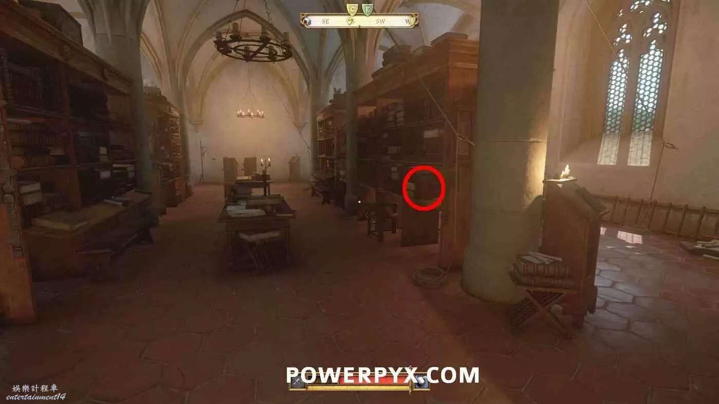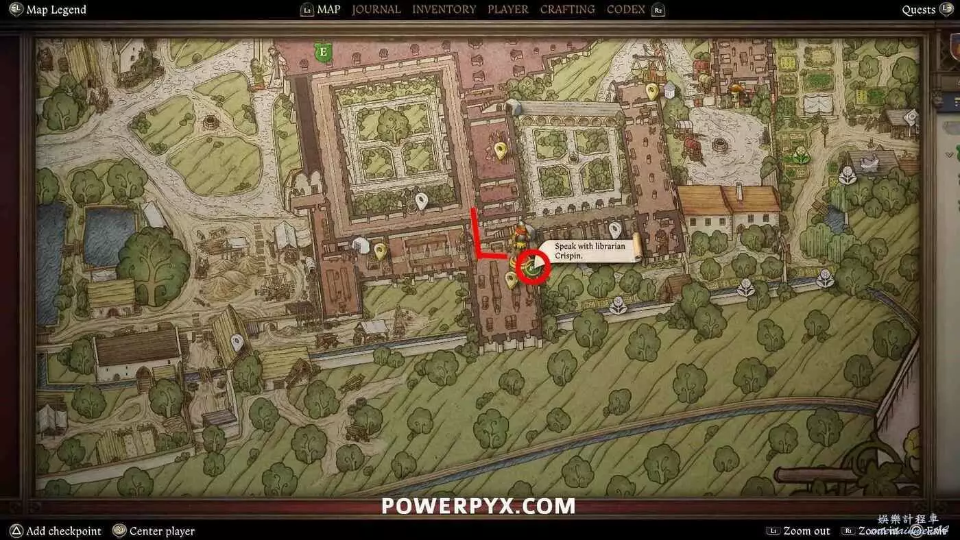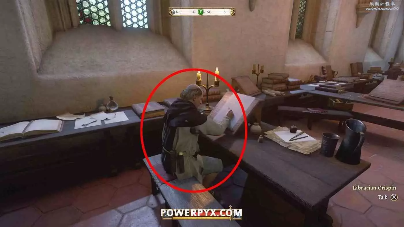 通過走廊上的門進入圖書館。與裡面的圖書館員克里斯平交談,位置會在地圖上標記顯示。