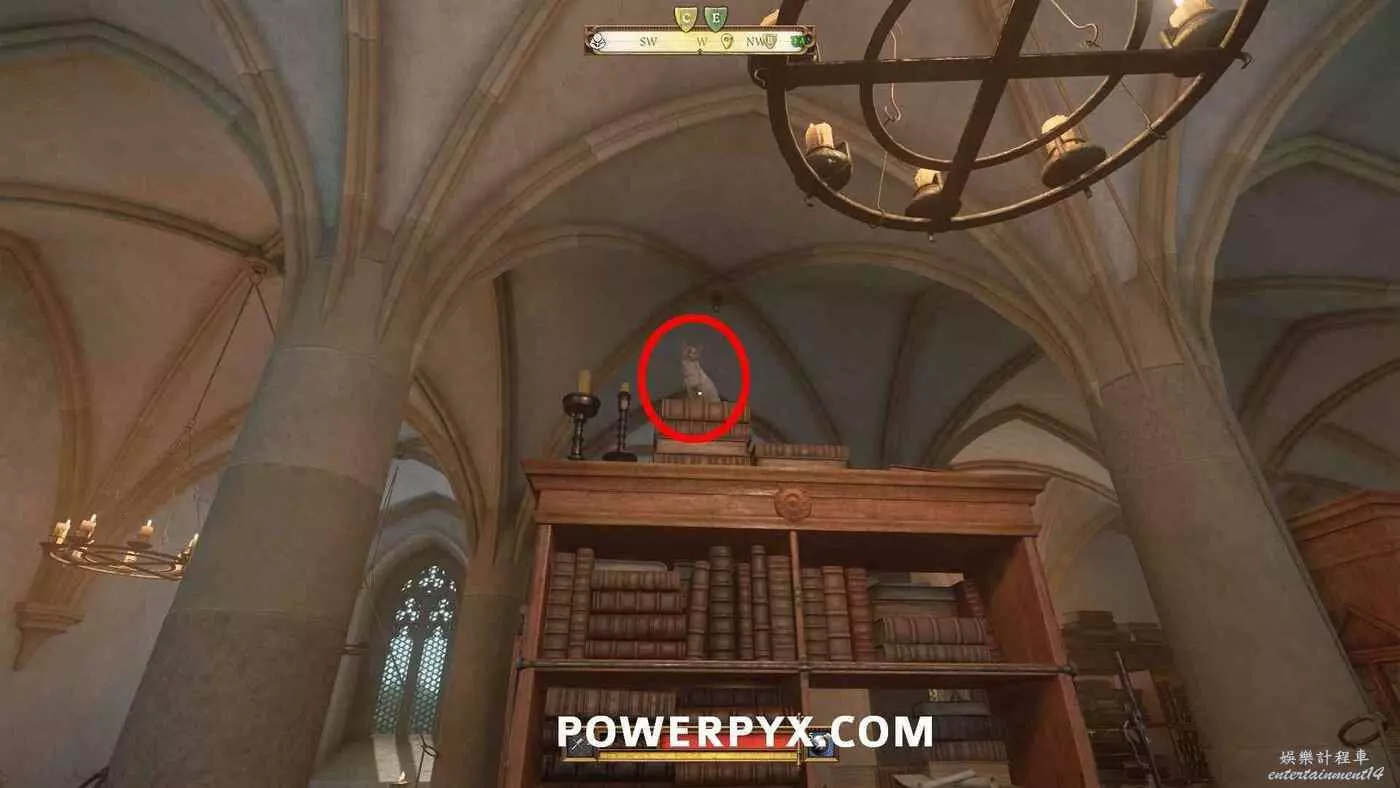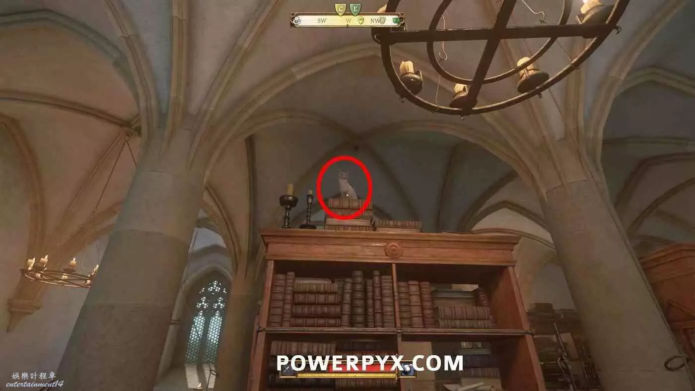 在圖書館的左後方角落裡,來到最後一個書架附近會彈出【L1/LB/ALT】按鍵提示與貓互動。往書架頂上看應該可以看到一隻小貓咪。如果貓沒有出現的話,可以製作一個退出存檔並重啟遊戲,有時會有BUG。建議在每個任務後檢查此位置,此獎盃需要在遊玩整個DLC期間多次與這隻貓互動才能解鎖。貓貓有時會刷,有時不刷,很隨機。