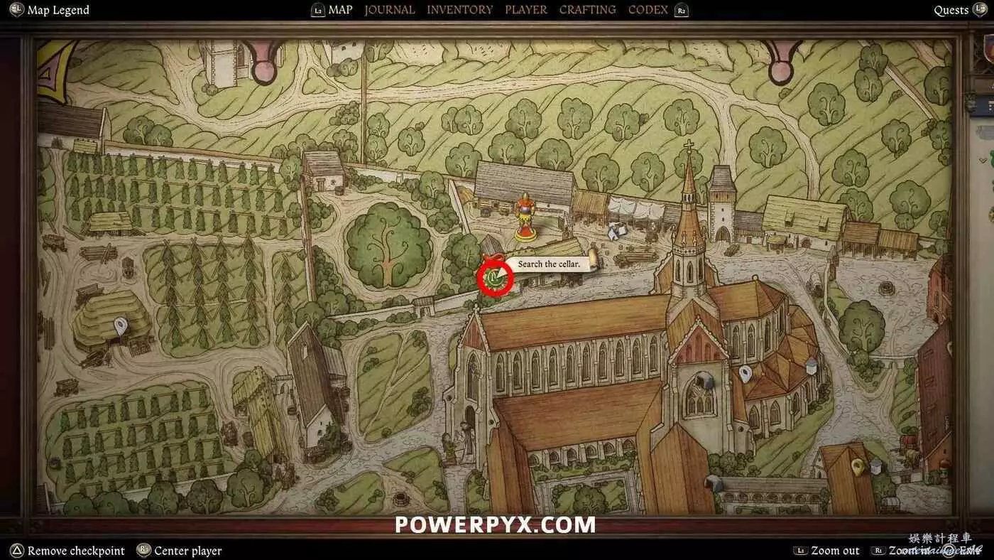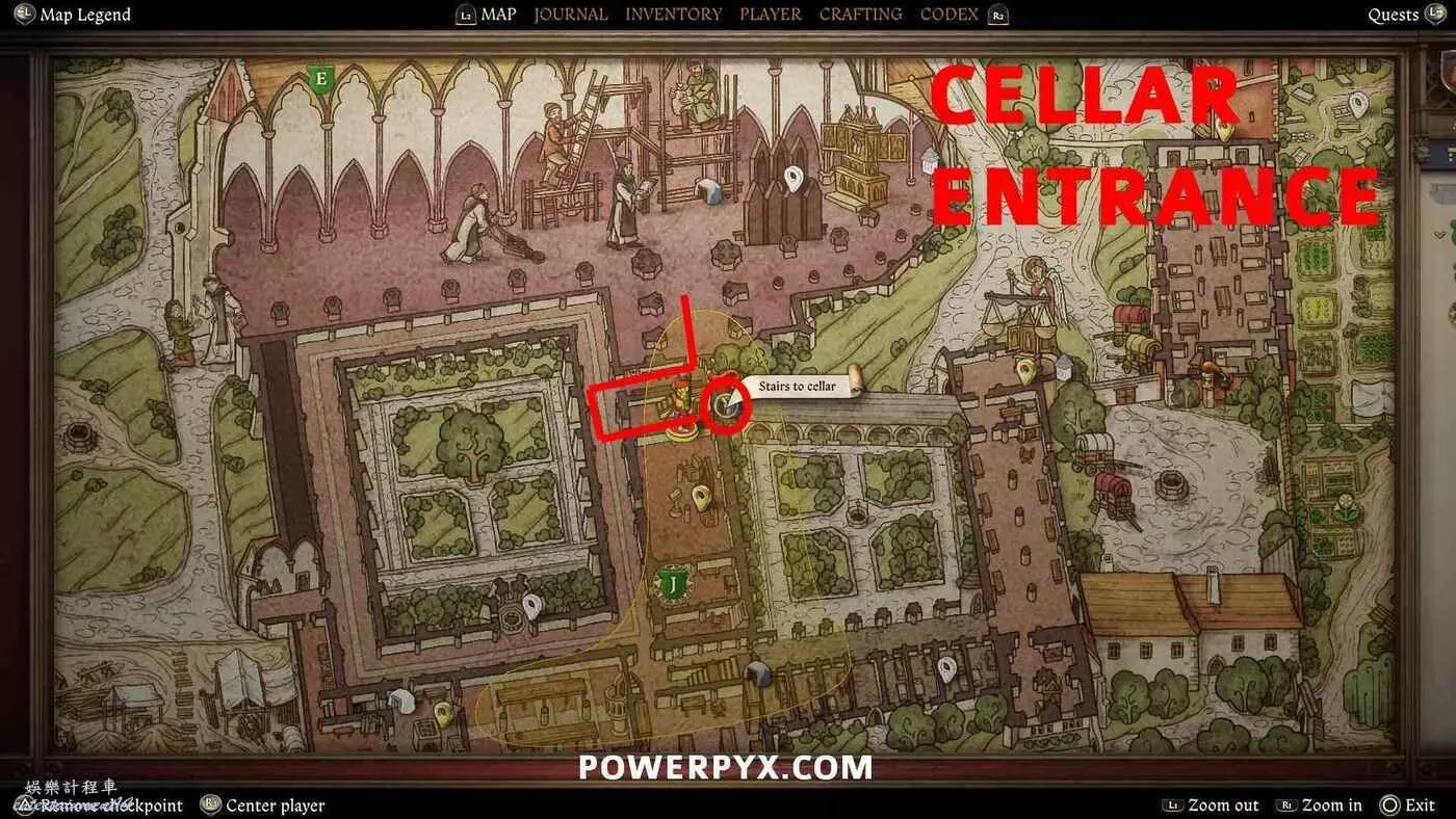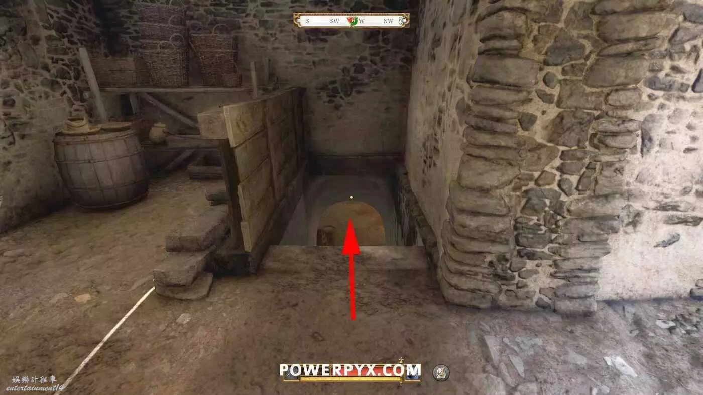地圖上會以洞穴標記顯示【通往地窖的樓梯】。地窖有多個入口,通過南門離開教堂返回中央庭院,然後走左邊的下一扇門,在樓梯下的走廊盡頭進入地窖的門。裡面非常暗,建議提前裝備火把(按十字鍵下)。