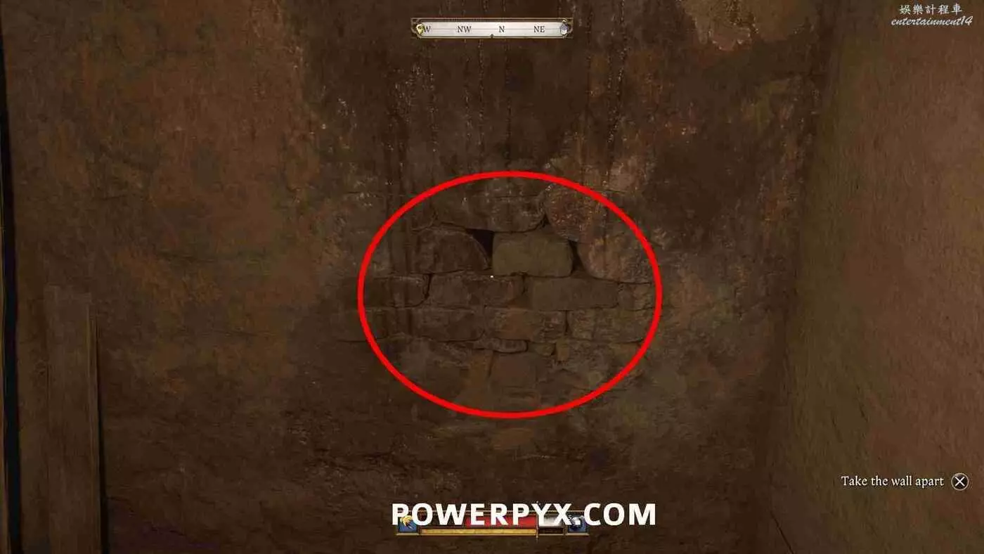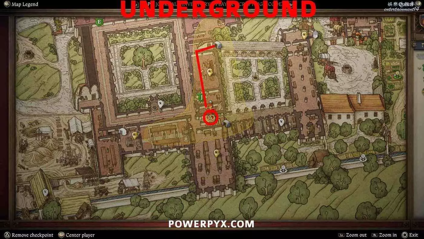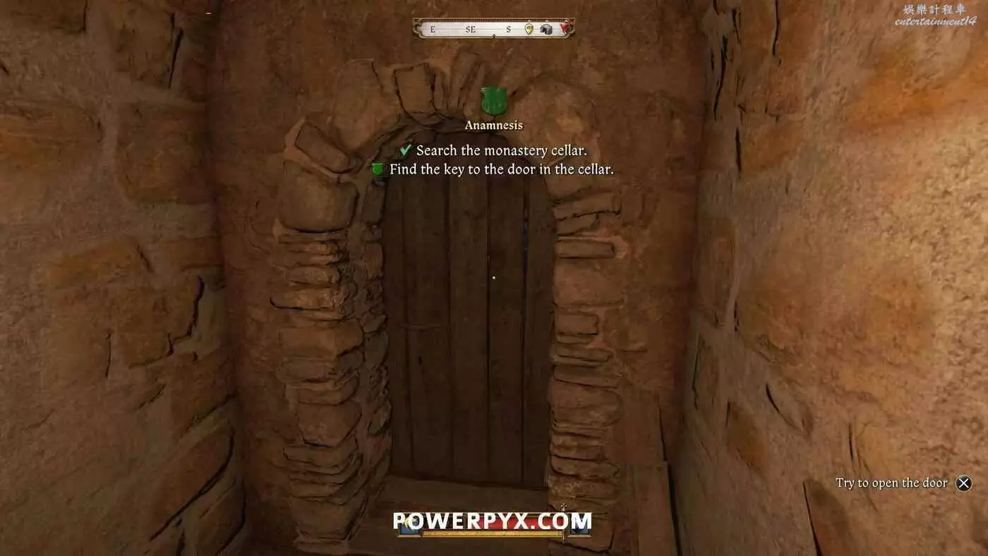地圖上會以洞穴標記顯示【通往地窖的樓梯】。地窖有多個入口,通過南門離開教堂返回中央庭院,然後走左邊的下一扇門,在樓梯下的走廊盡頭進入地窖的門。裡面非常暗,建議提前裝備火把(按十字鍵下)。