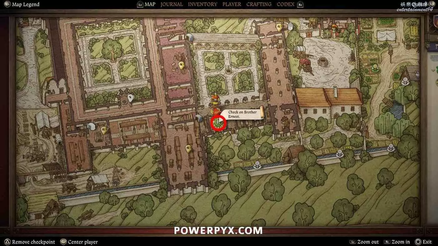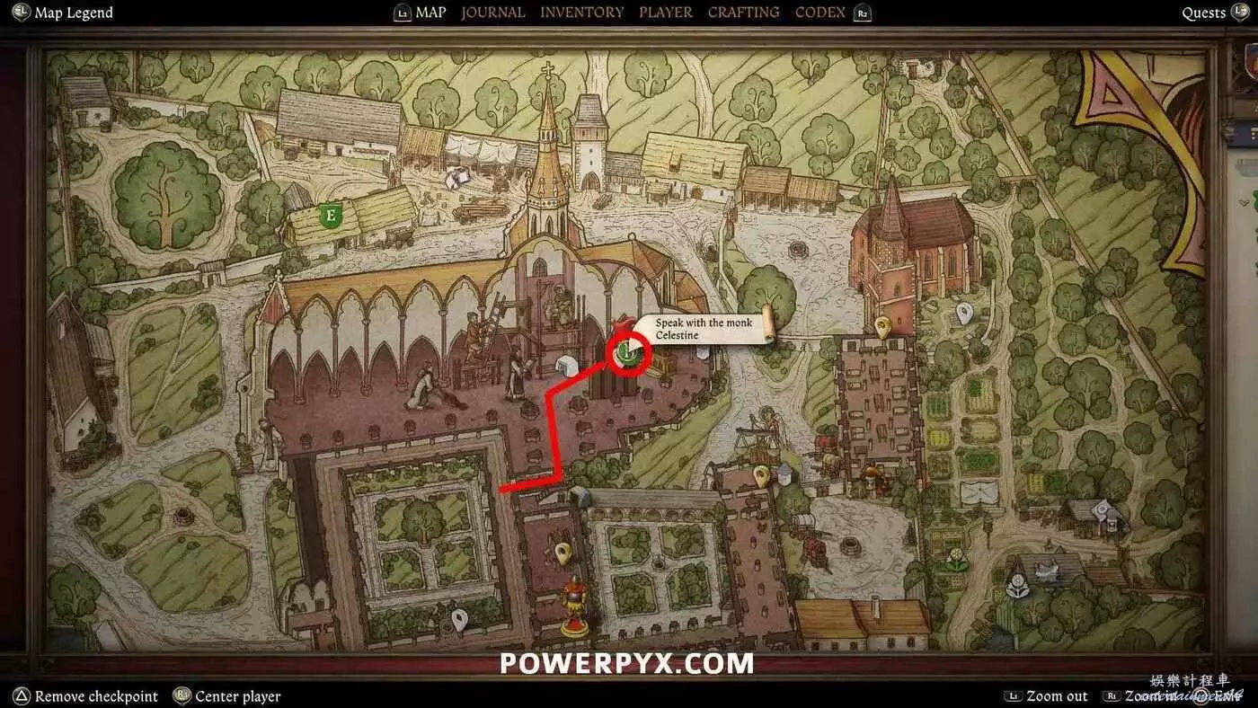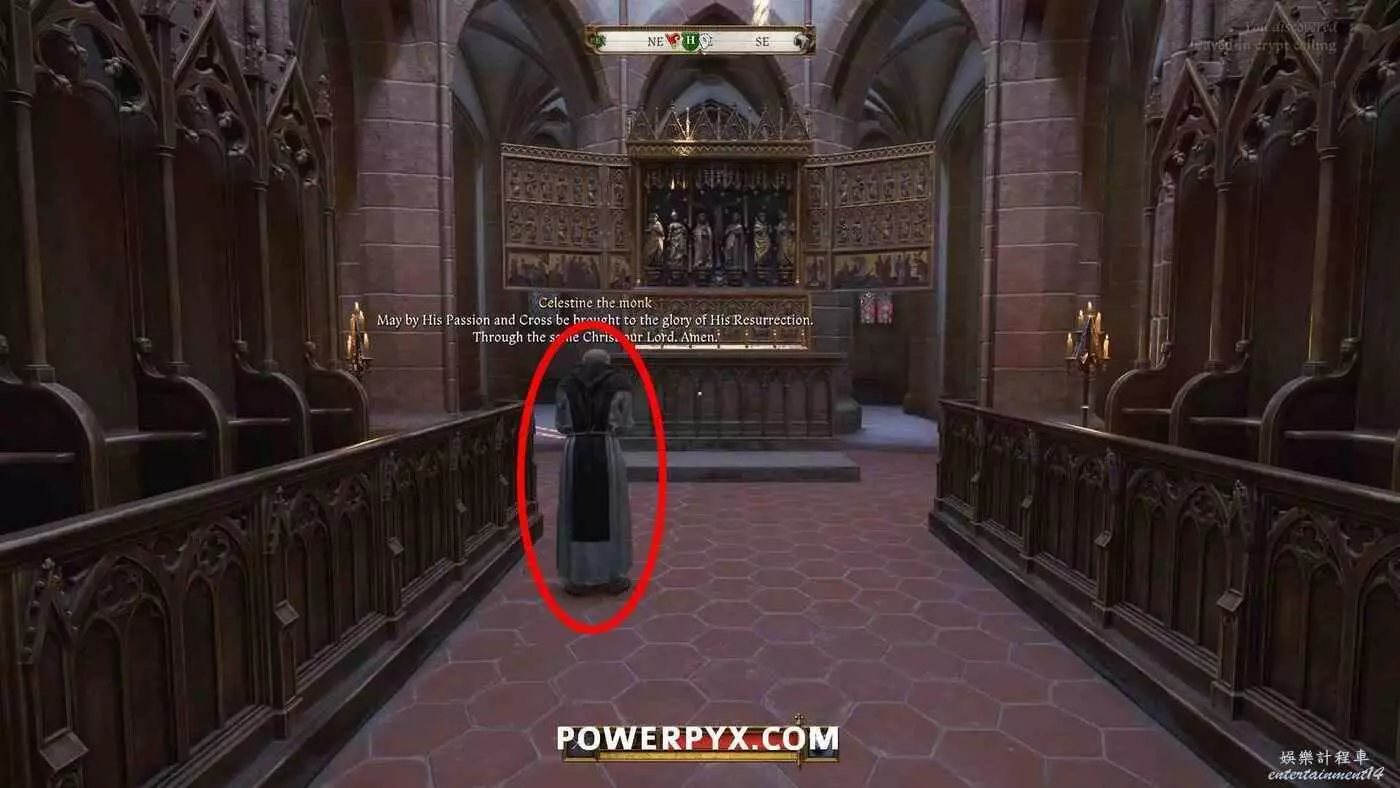 塞萊斯廷修士在主教堂的大廳裡,從此任務初始位置的中央庭院東北邊的門進入,參考下方地圖。