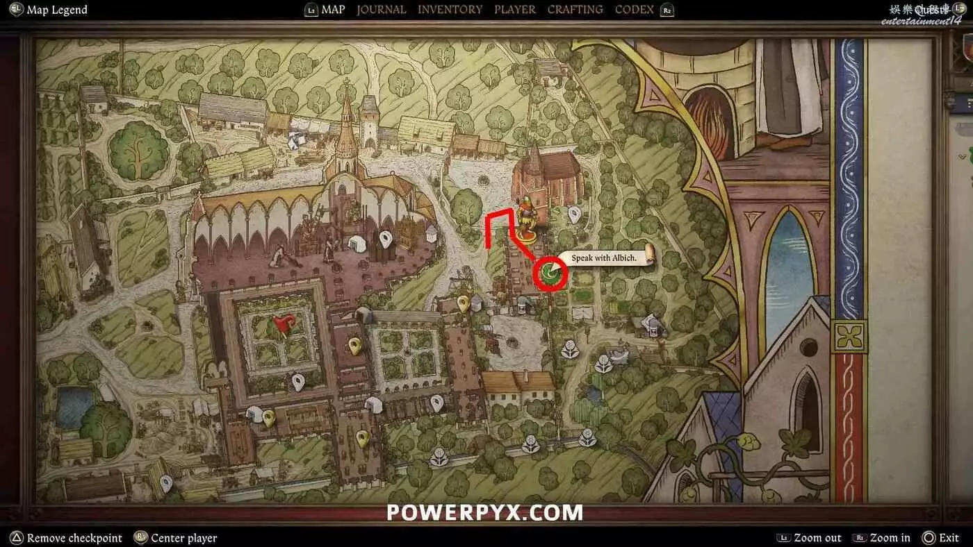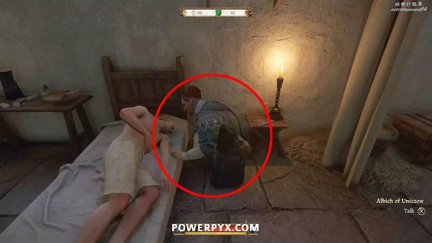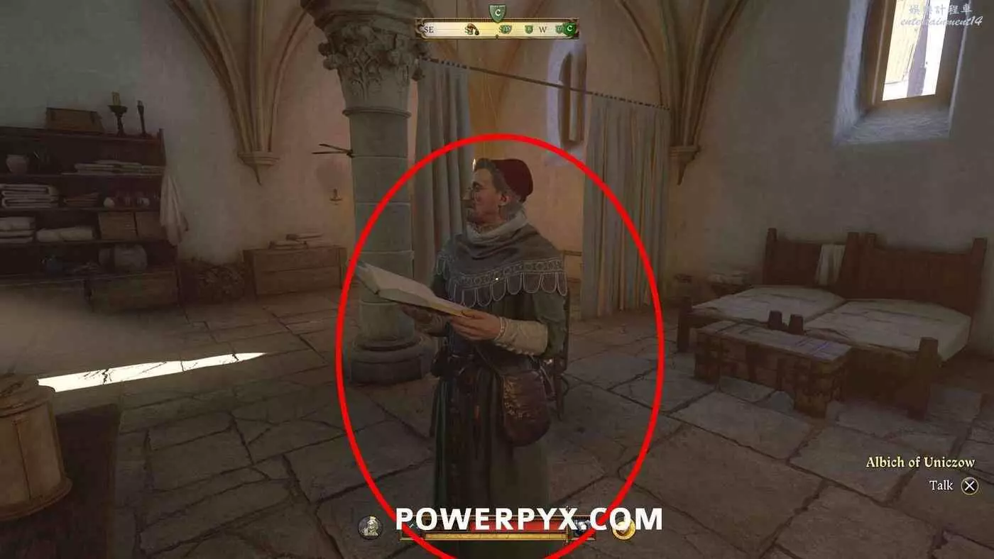 進入修道院東北角的醫務室,就是紅色的像教堂一樣的建築。進入放著病床的房間與阿爾比赫交談。如果之前與佩特羅米爾參觀了修道院,那麼此時阿爾比赫就會在此處等候。