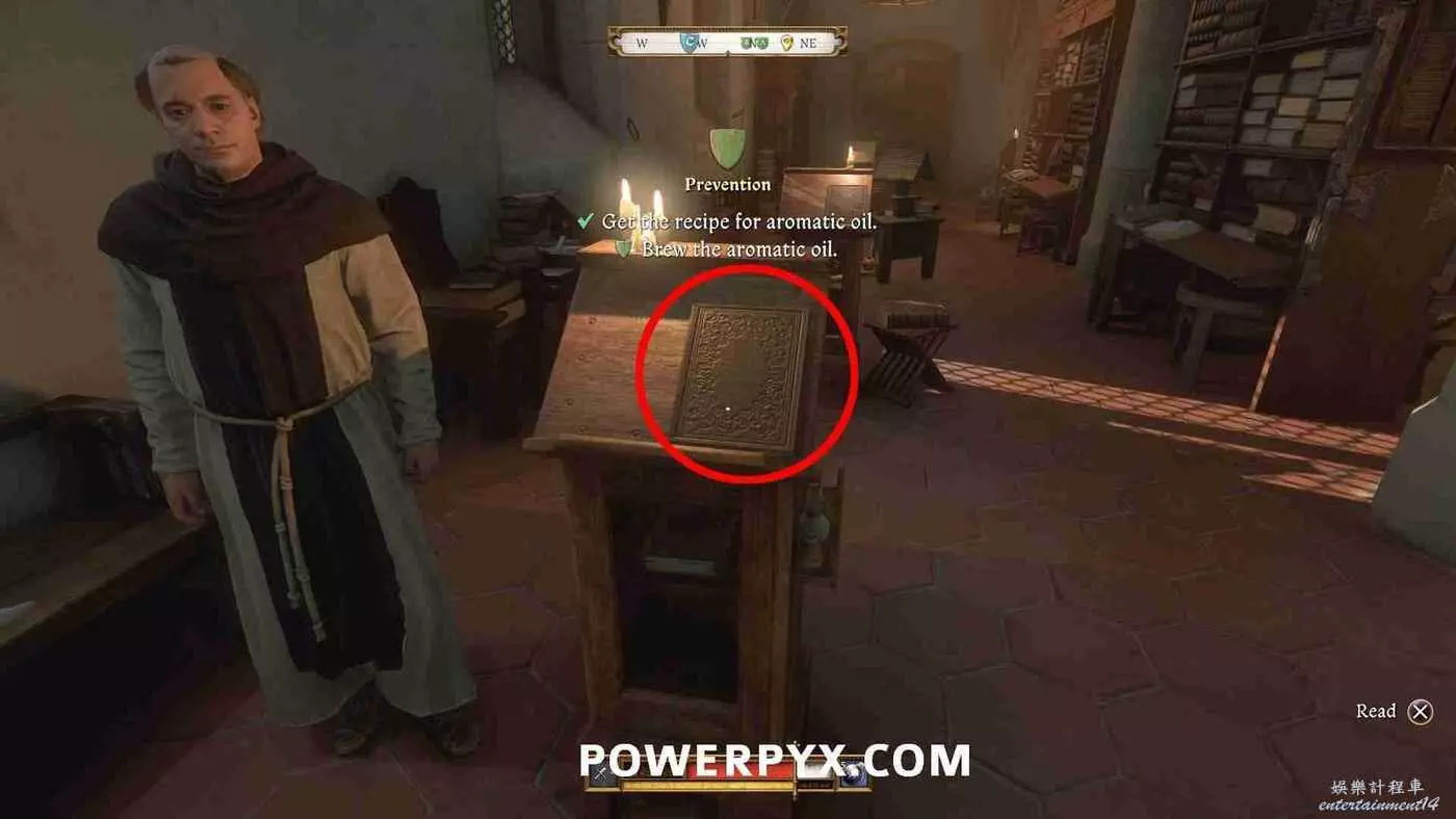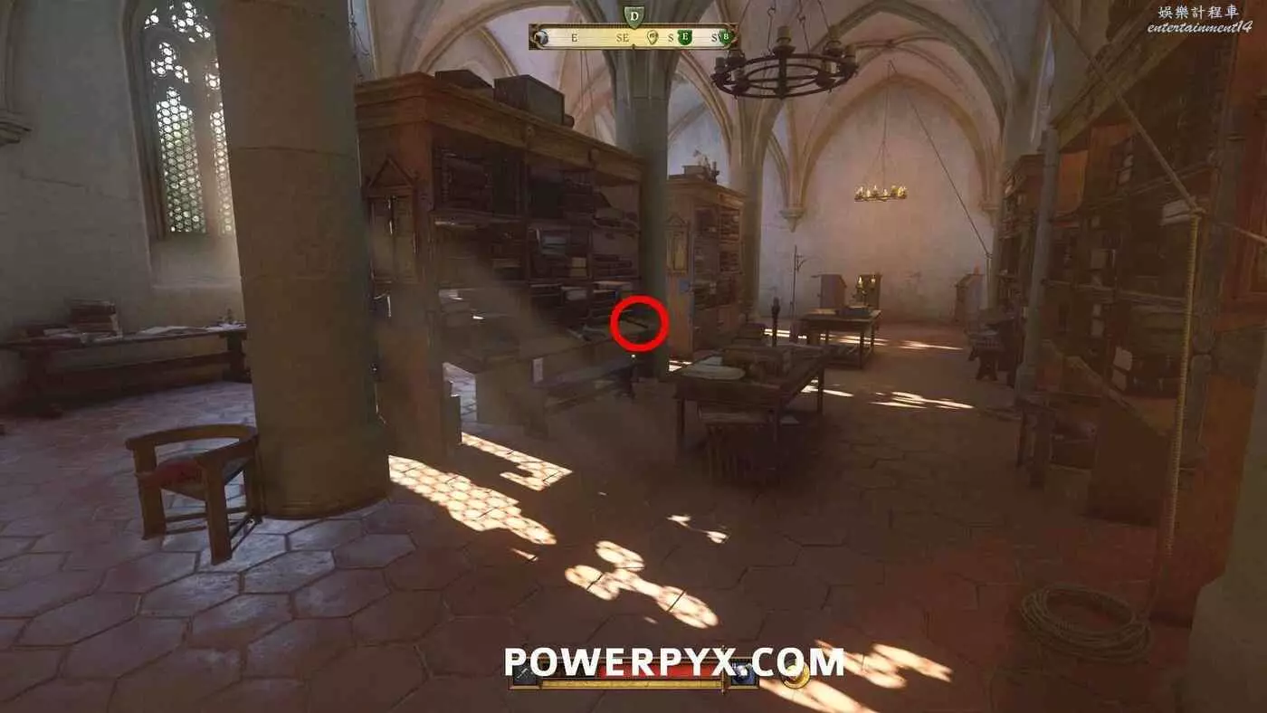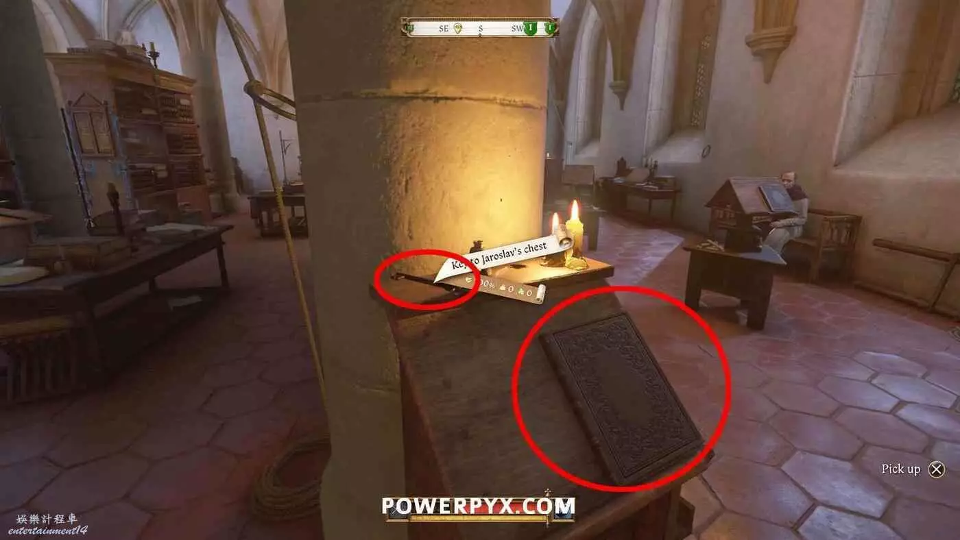 有兩件物品需要檢查。首先在圖書館出口處的台子上閱讀書本並拿起台子頂端的鑰匙。得知雅羅斯洛夫並沒有如所說的那樣去完成工作。注意此目標一定要在與修士塞萊斯廷交談之前完成,否則不會觸發額外對話。