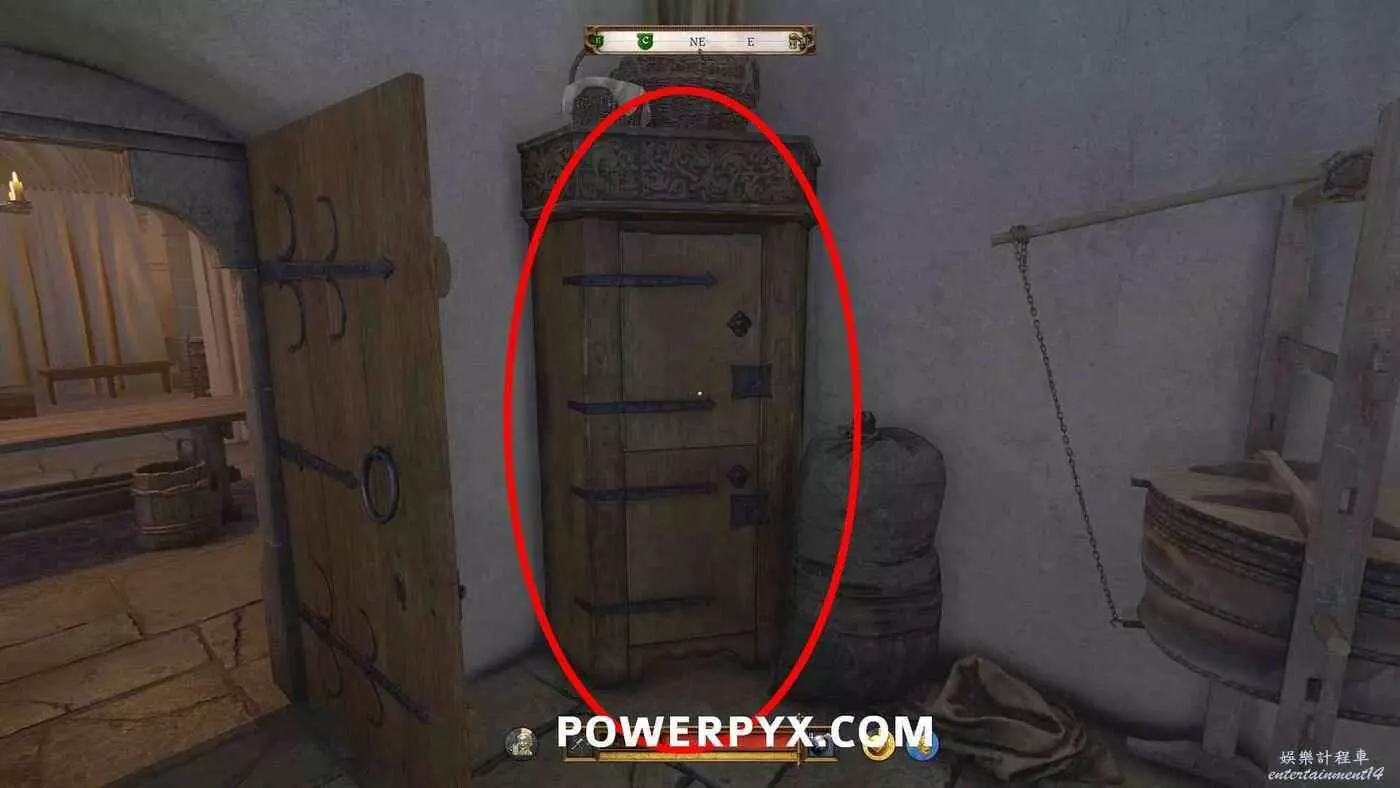然後朝著腳印指引的方向爬過架子。穿過木桶,在梯子旁邊看到酒窖密室的門。門上了鎖,觸發任務目標【尋找酒窖密室的鑰匙】。
