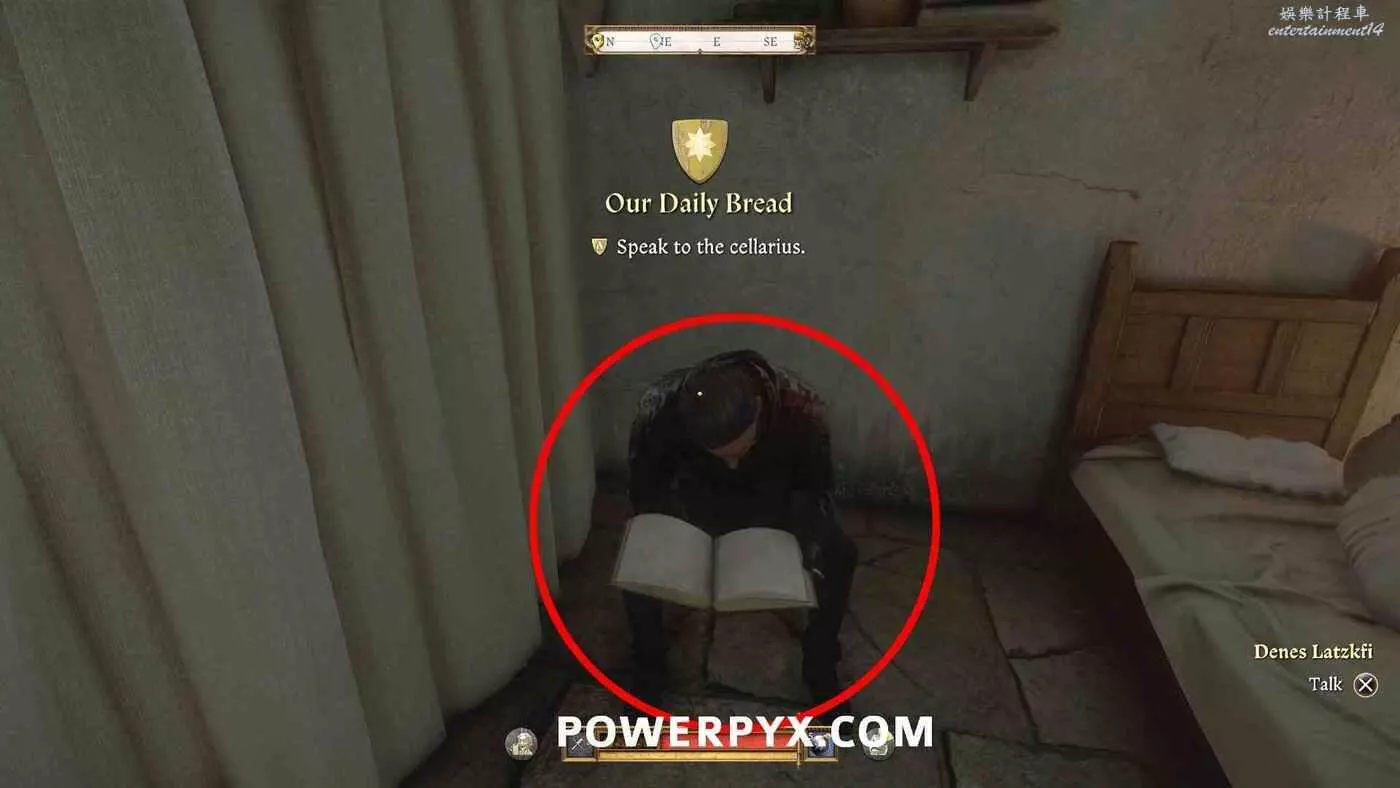 此步驟需要與以利亞修士交談,可以在靠近修士時按【L1/LB/ALT】鍵叫他,但他不在宿舍。詢問其他修士以利亞在哪裡,其中一個會說他在地窖,從而更新地圖標記。從廚房進入地窖,在搜索區域中間的大地窖房間裡找到以利亞。