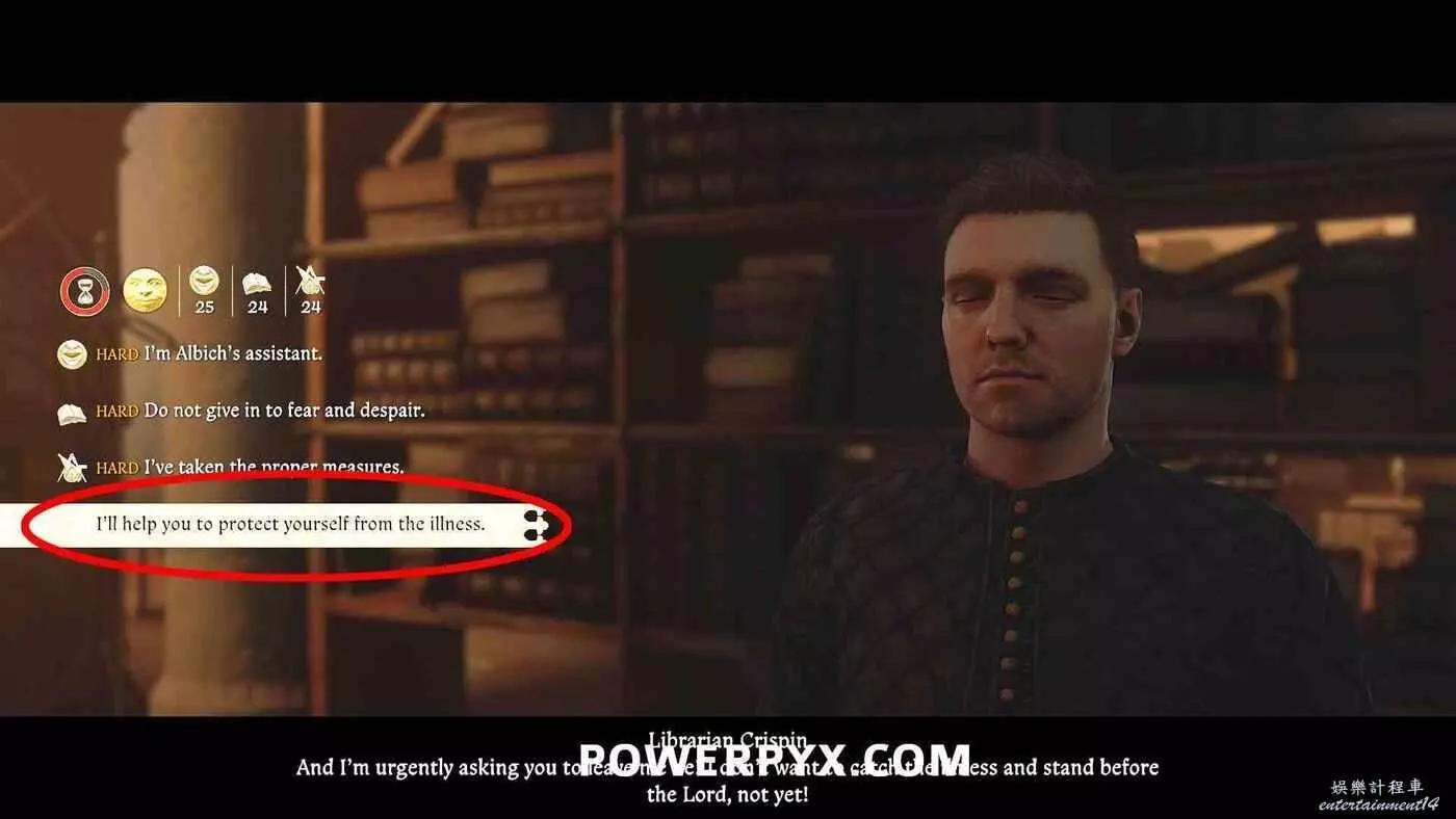 【是黑死病嗎?】→【我很抱歉(+聲望)】→【病人是誰?】→【他們三個怎麼都病了?(成功可能需24學術,+聲望)】→【該怎麼辦,阿爾比赫?】→【那好吧】。