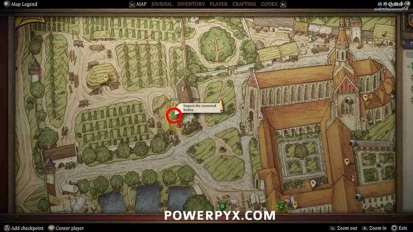 前往修道院西南邊的B標記點。從北邊靠近,進入帶有燒毀穀倉的院子。
