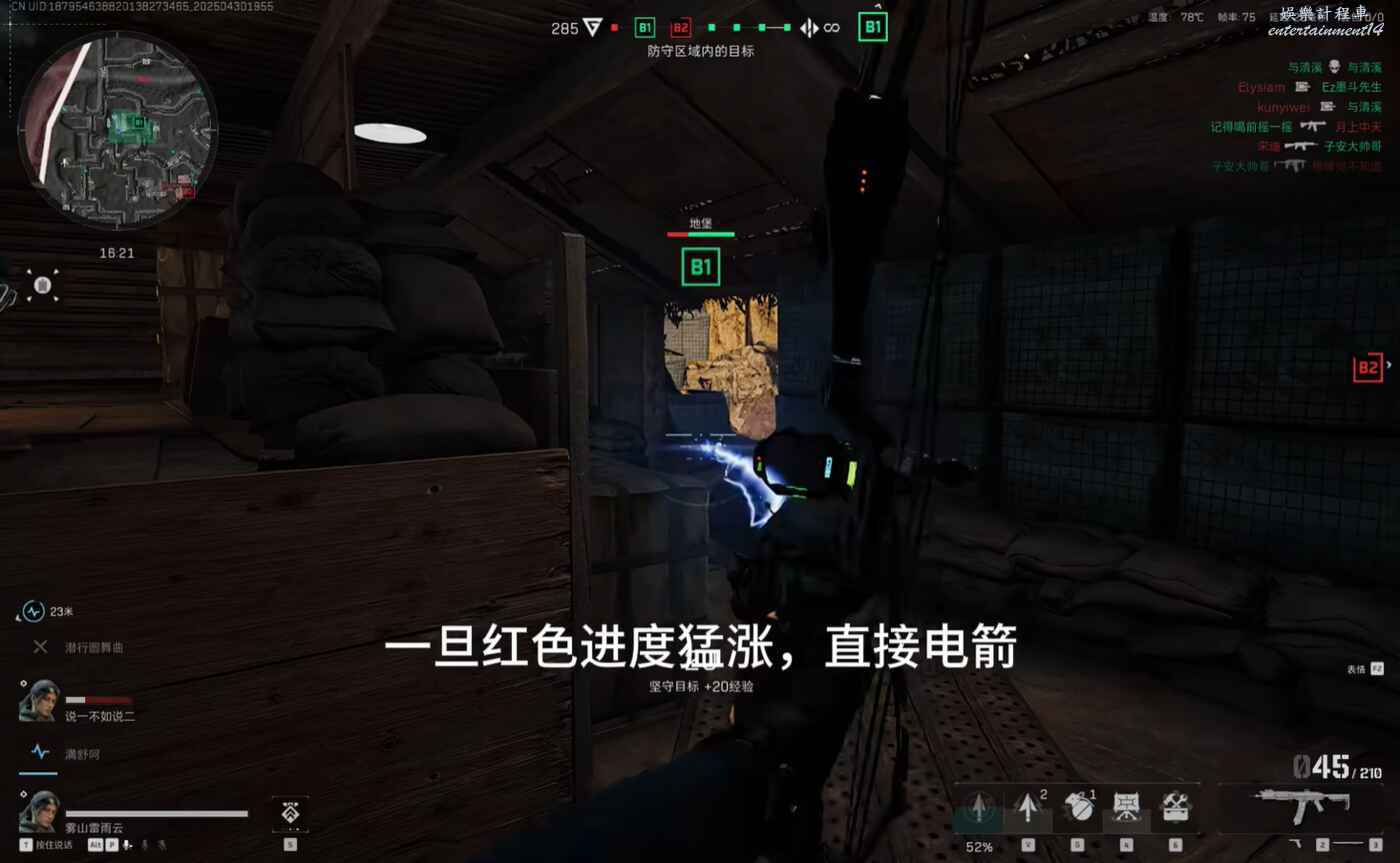 當你與對面對槍的時候,如果對面躲在掩體後面遲遲不肯出來,可以朝掩體的一側射箭,通過持續不斷的電擊傷害逼迫他必須從掩體的另一頭跑出來,而你要做的事就是架好這個出口,在他慌不擇路跑出來的時候幹掉他。常常用於防守燼區a點,燼區b1和塹壕戰c區域的瞭望台等。