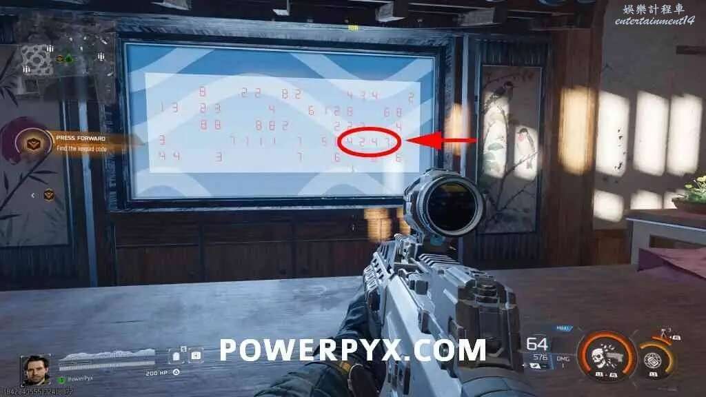 觀察櫃台後方牆上的大螢幕(盆栽園牌子下方),會閃爍顯示大量數位,其中有一組密碼始終顯示且不會閃爍。如下圖所示螢幕中的密碼就是4247(每個玩家隨機),螢幕上連續顯示且永不消失的4位元數位即為正確密碼。