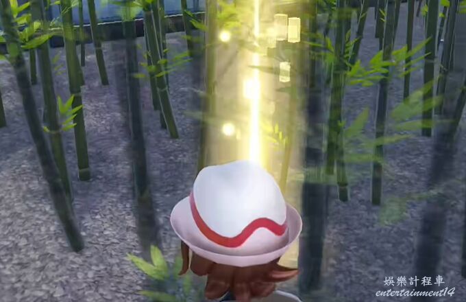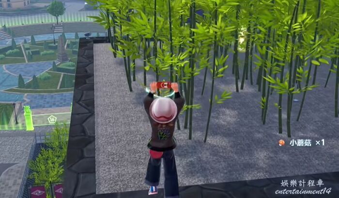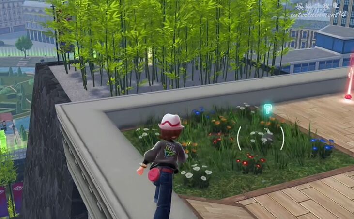 3、上去後玩家可以看到左邊有個上面長滿竹子的屋頂,使用滑翔落到上面。