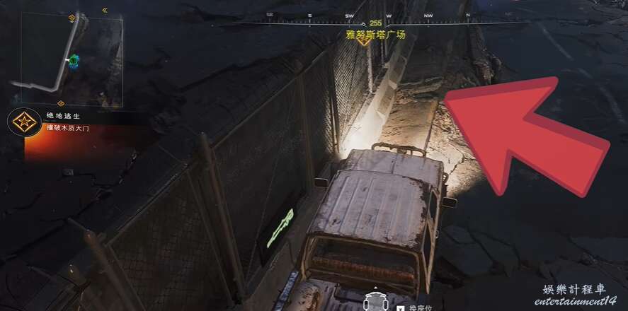 第一步: 駕駛卡車,對準下圖所示位置,從卡車的側後方以大約45度角撞上去,與卡車實現“卡模型”。