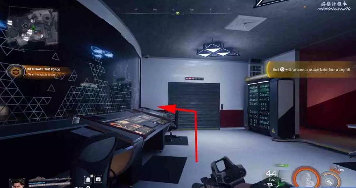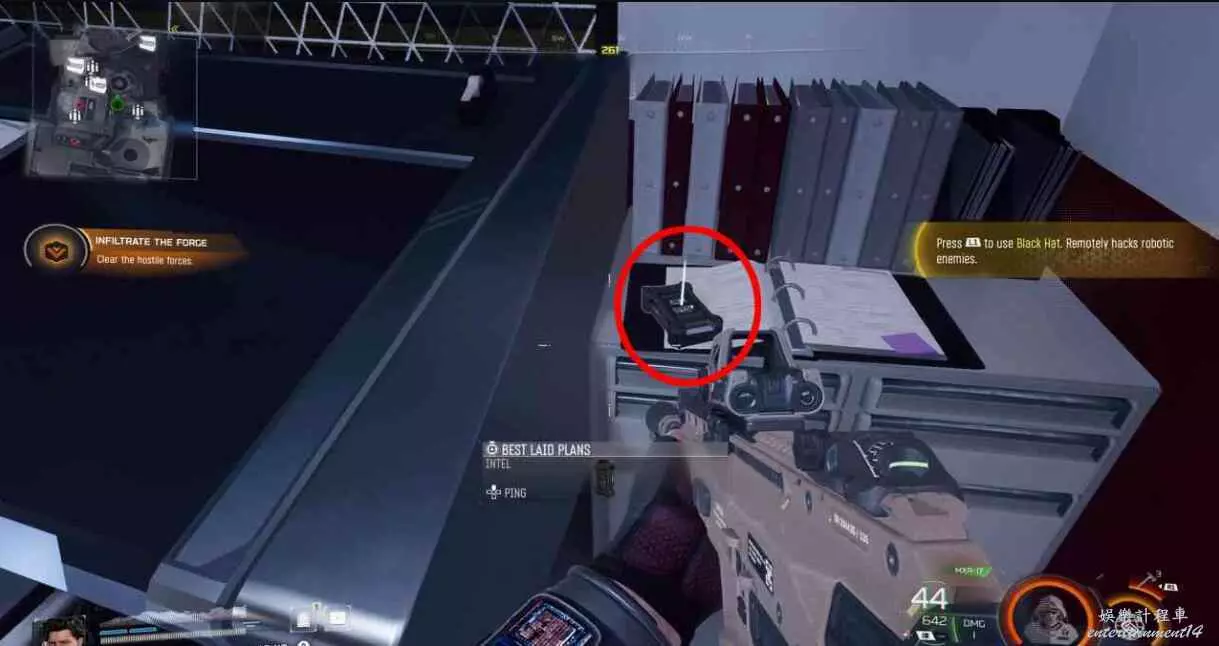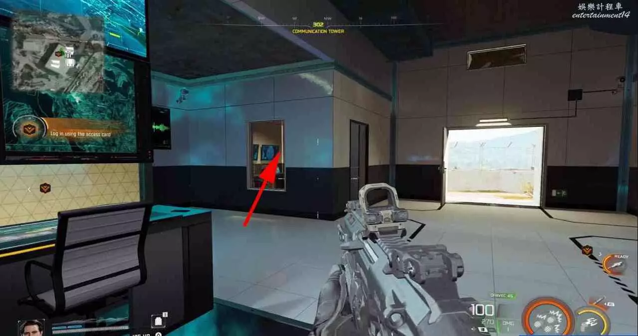 擊敗狙擊手Boss後,前往山坡上的建築。進入建築後,找到標有“使用門禁卡登錄”的主目標房間。在該房間角落的小辦公室內,檢查地面上的機器人殘骸以獲取情報。