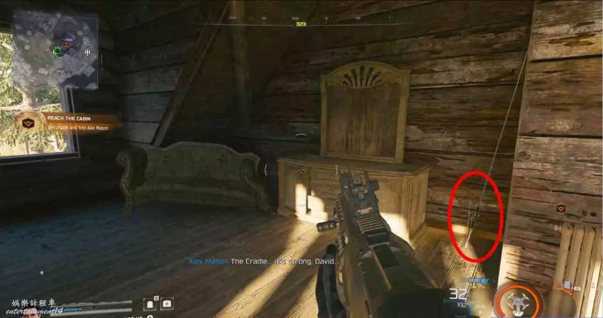 進入木屋後,沿右側樓梯上行,進入右手邊房間,在房間轉角處找到靠在牆角的釣魚竿,互動獲取情報。