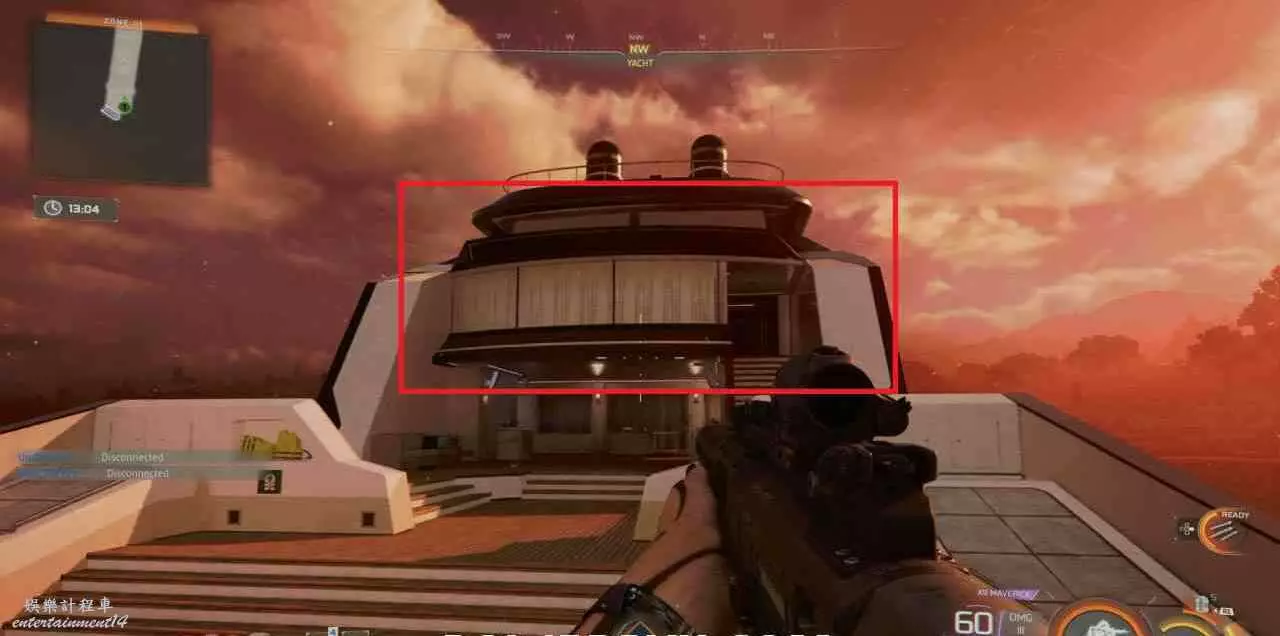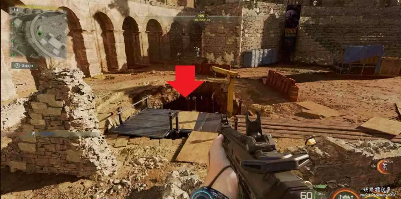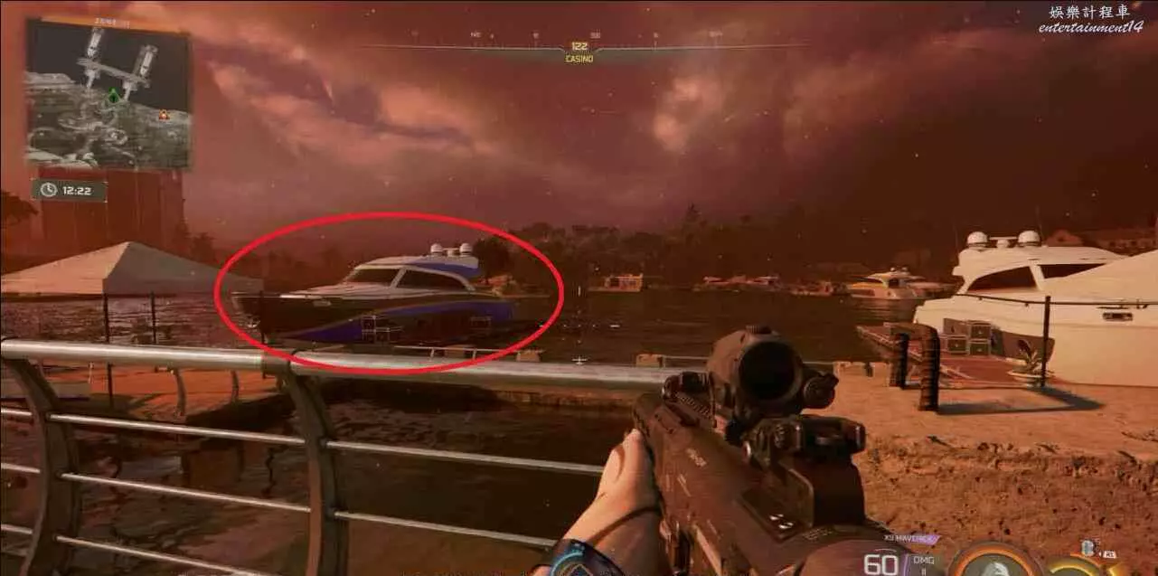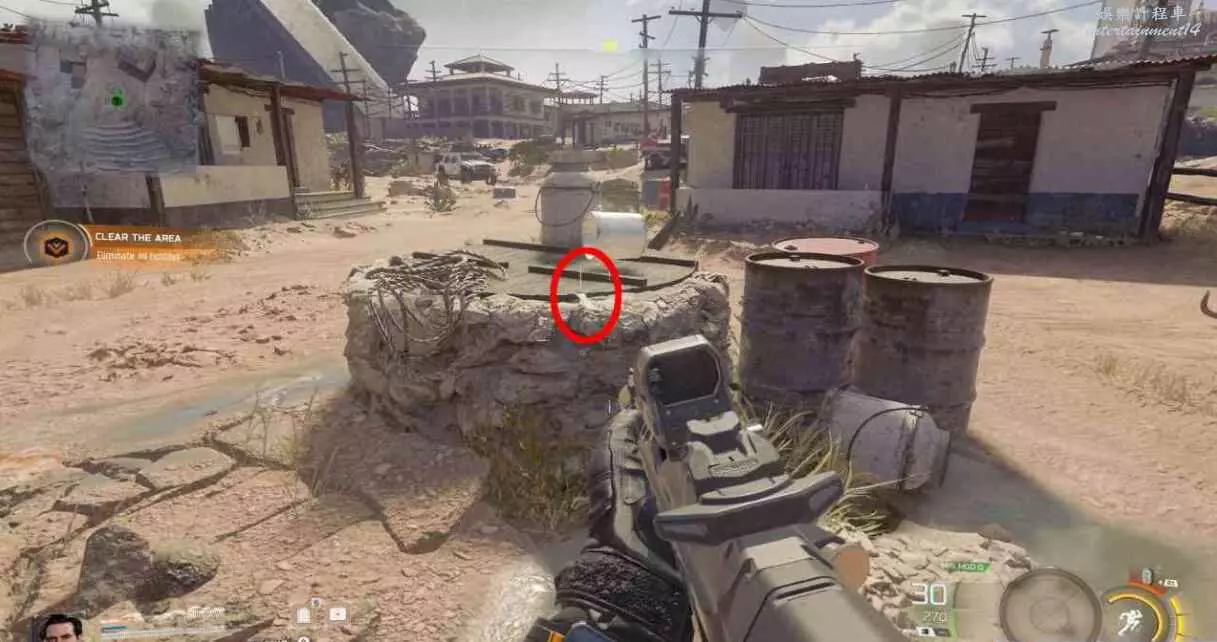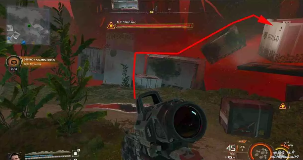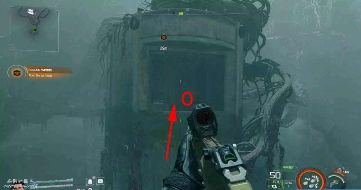 乘船穿過血池房間後,沿路徑進入下一區域,目標為開啟一處集裝箱。在啟動集裝箱前,先繞至其後方,使用抓鉤抵達遠處平台,平台上有自救道具與連殺獎勵。