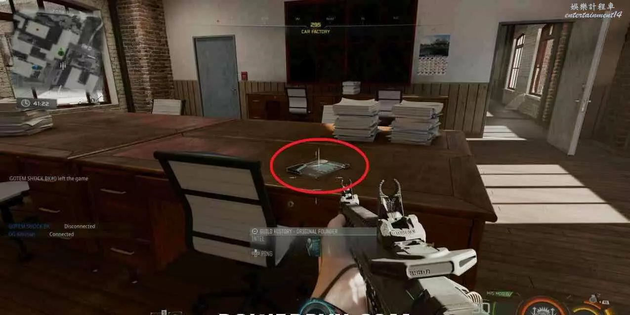 描述:在汽車工廠位置,進入北側的L形建築,上到二樓。進入東南房間,檔在桌子上。