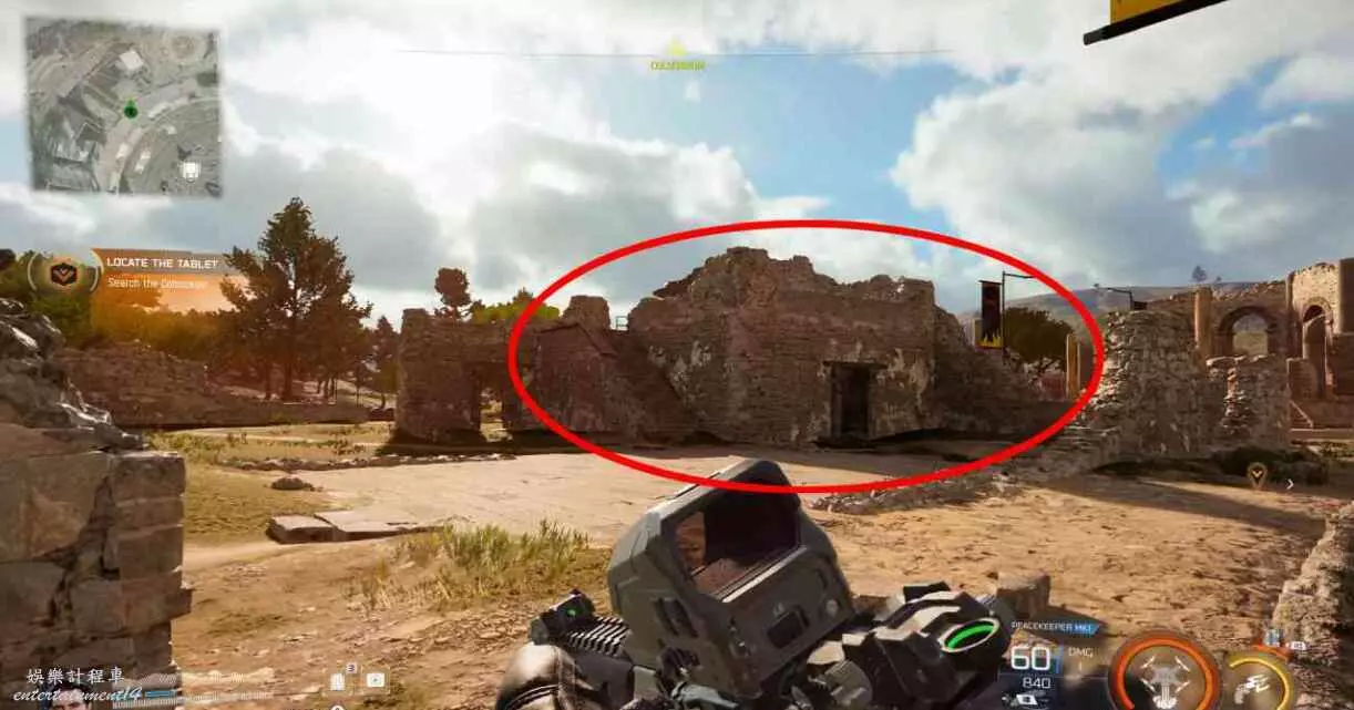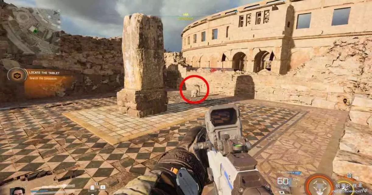 任務開始不久後抵達競技場區域時,向左環繞至週邊,前往最北端的石制廢墟。走上廢墟二層,與放置在地面的石雕頭像互動獲取情報。