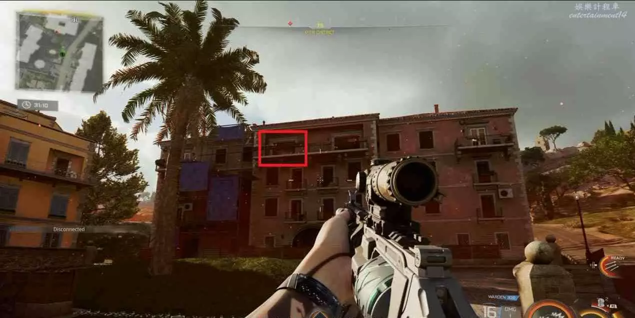 描述:在碼頭區,爬上腳手架到達中間有洞的建築頂層,檔在床右邊的箱子上。