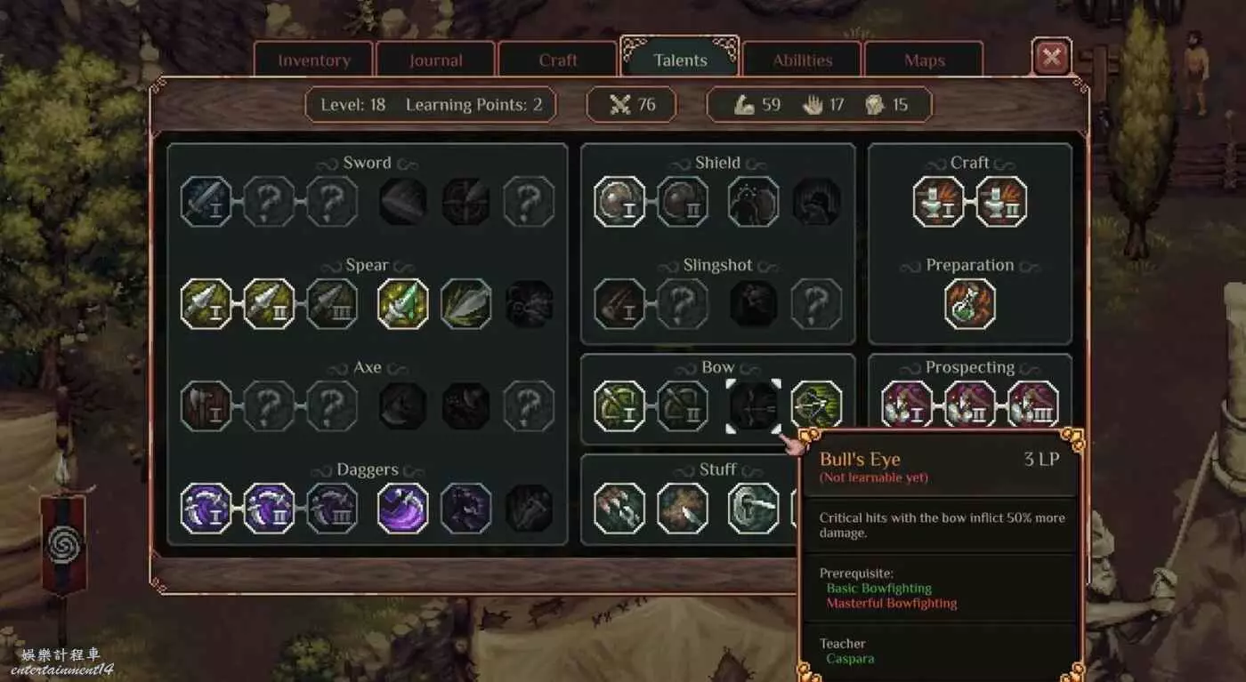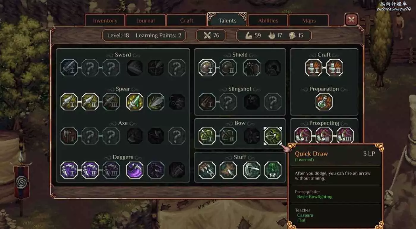 卡斯帕拉:內梅頓外營地——基礎弓箭戰術,精湛弓箭術,快拔,靶心法