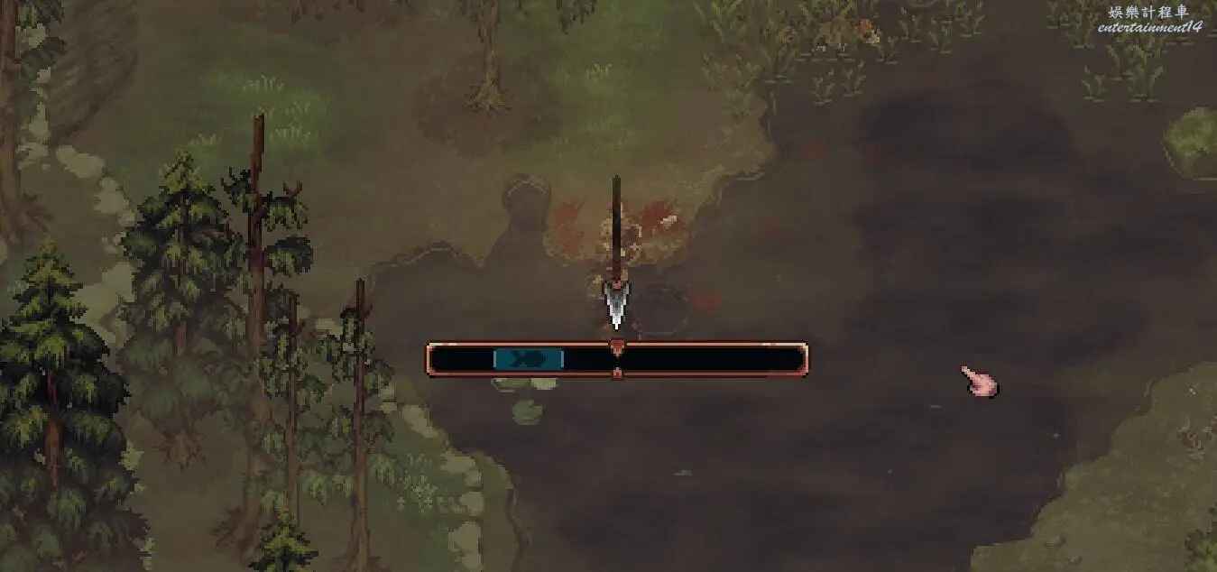 本作中釣魚不需要魚竿,在河邊發現魚的標記後靠近點擊互動就可以開始抓魚,下面藍色標記移動到長矛下時點擊滑鼠即可。