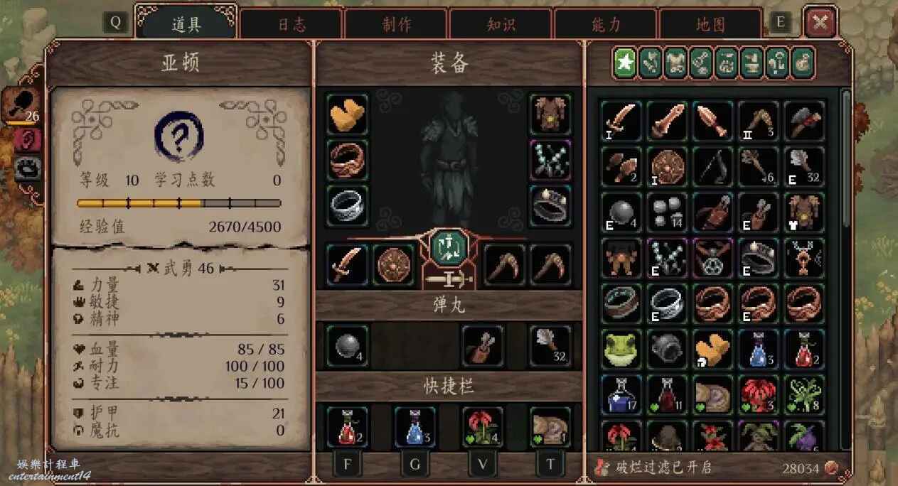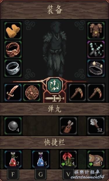 裝備欄中,我們可以攜帶2套武器和1件防具、1件頭盔、4件飾品、3種投射相關物品與4個消耗品,可以通過滑鼠拖動替換裝備與道具。
