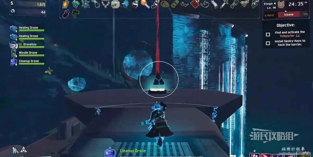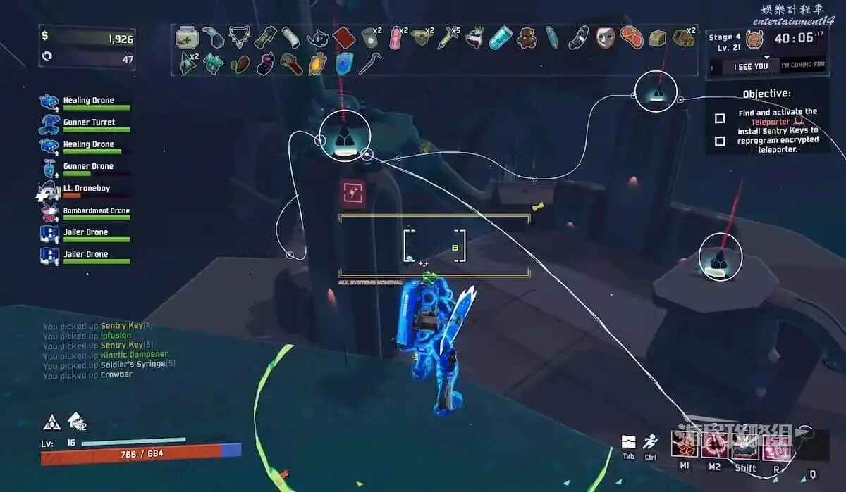 破解屏障需要3把金鑰,把金鑰安裝在3個哨兵終端上即可,可以通過滑索裝置來快速移動到終端所在位置。
