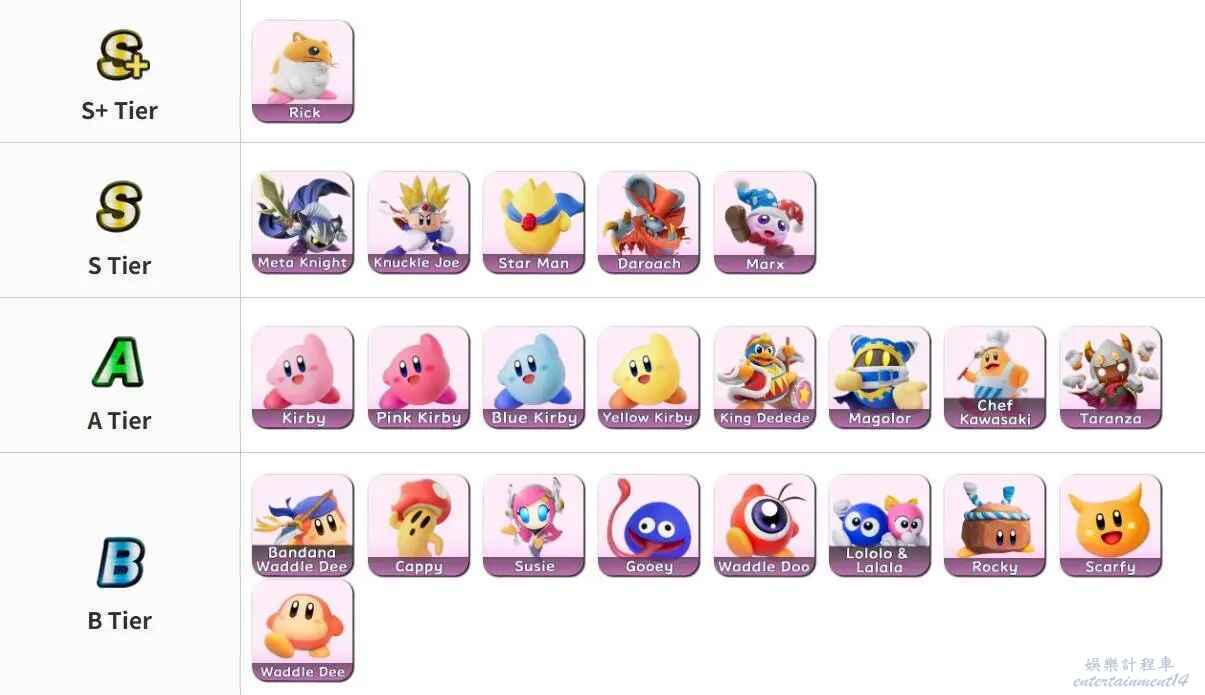 卡比的馭天飛行者 角色強度排行 20 11 月 2025-11-20 廣告 來源:game8 綜合分級列表 S+級:瑞克 S級:梅塔騎士、拳擊喬、斯塔曼、達奧奇、馬克斯 A級:卡比、粉色卡比、藍色卡比、黃色卡比、帝帝帝大王、魔洛屈、廚師川崎、塔蘭紮 B級:頭巾瓦豆魯迪、卡比、蘇姿、古依、瓦豆魯篤、羅羅洛&拉啦啦、洛奇、斯卡菲、瓦豆魯迪 分級列表排名說明 當前的等級清單基於對遊戲的初次通關體驗。 此等級清單考慮了該騎手及其特殊能力在遊戲所有模式中,與其他騎手相比的表現情況。