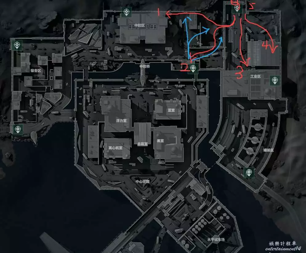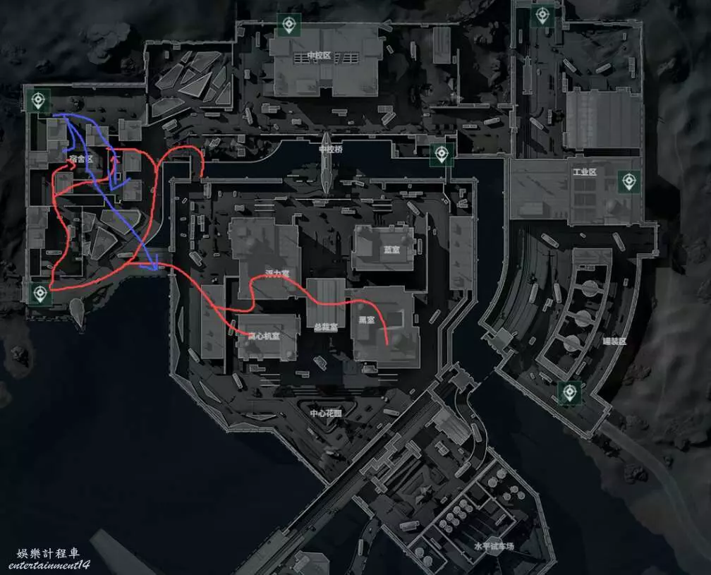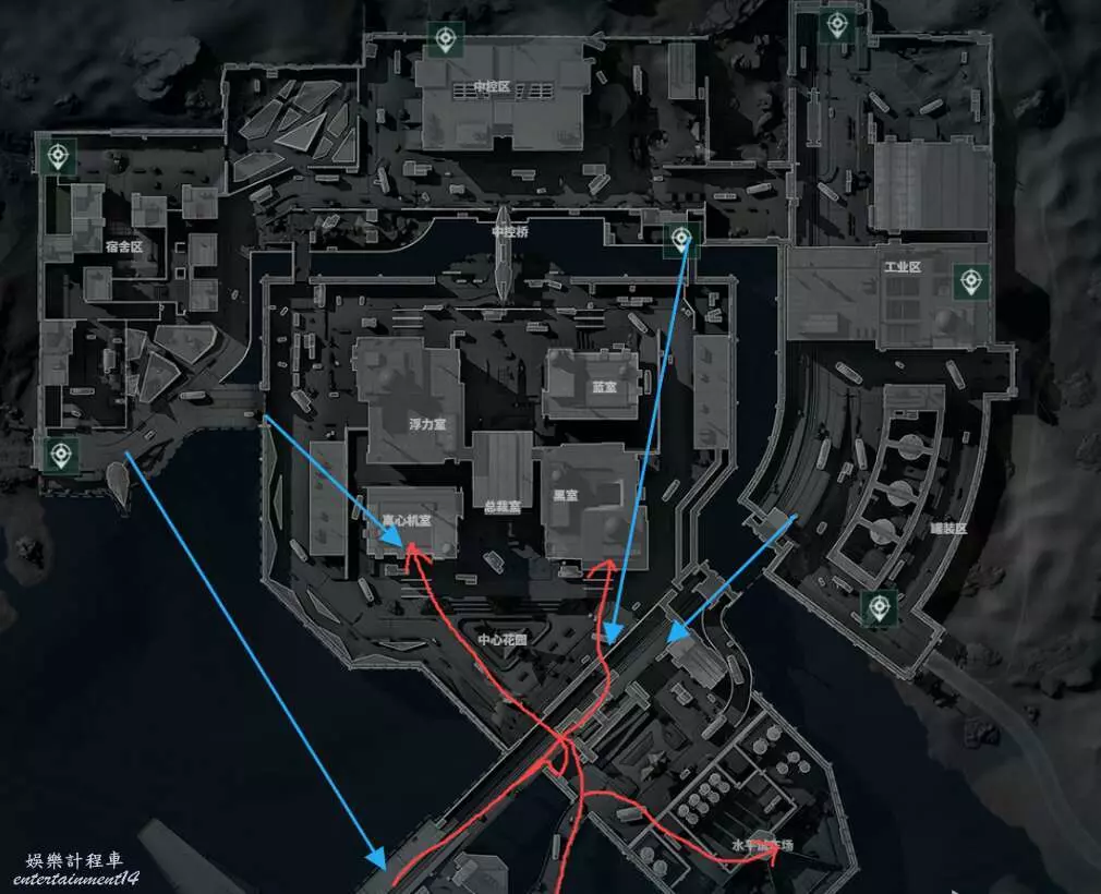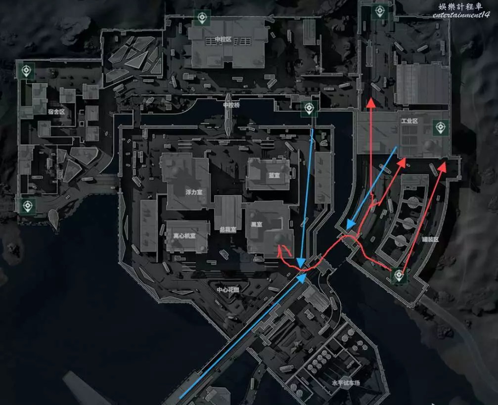 牢大開局五種路線,第一和中控爆了。風險大收益也低,沙地中控二樓槍位很劣,不推薦這條路線,並且去中控途中,可能被二員神人抽。(藍色標記路線即二員可能路線與槍線)
