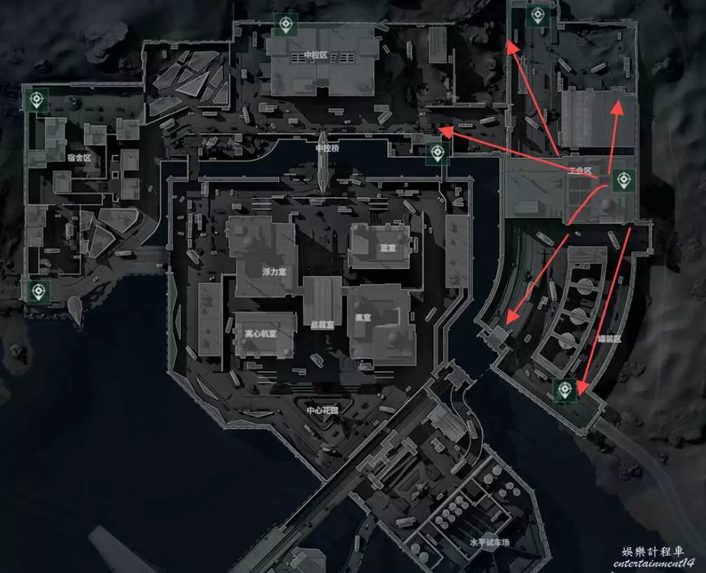 最好復活點,全家活光光,小心中控直接上橋抽就好了,主動權全在我們手上,可以卡住中控,卡住牢區,也可以光速上總裁爽吃,有時候可以一隊吃三四個核心室。要打就回頭架住牢大,吃裝備,要搜就開卡,不開卡走橋底建議去浮力,滑索右手邊,吃完去黑市,然後就往丟包趕。小心中控直接上橋抽人就好。