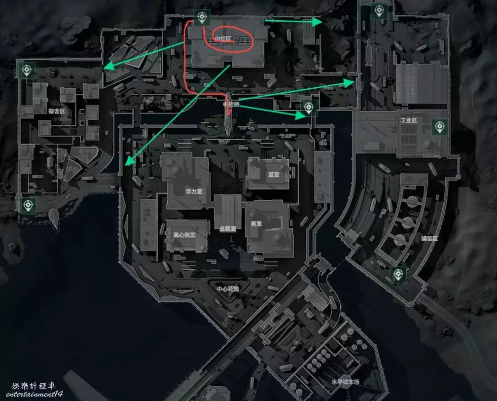 活光光,退可吃完保險光速跑路,進可陽台一站架住四隊人馬,聽槍勸架。開局不進樓直接走右側上橋能逮住員二,沒打煙的話基本能拿下一個到兩個。綠色箭頭是要注意人的方向,開局基本不用管宿舍,只需要聽槍聲即可,沒有遇到過神人不吃宿舍趕來中控的。