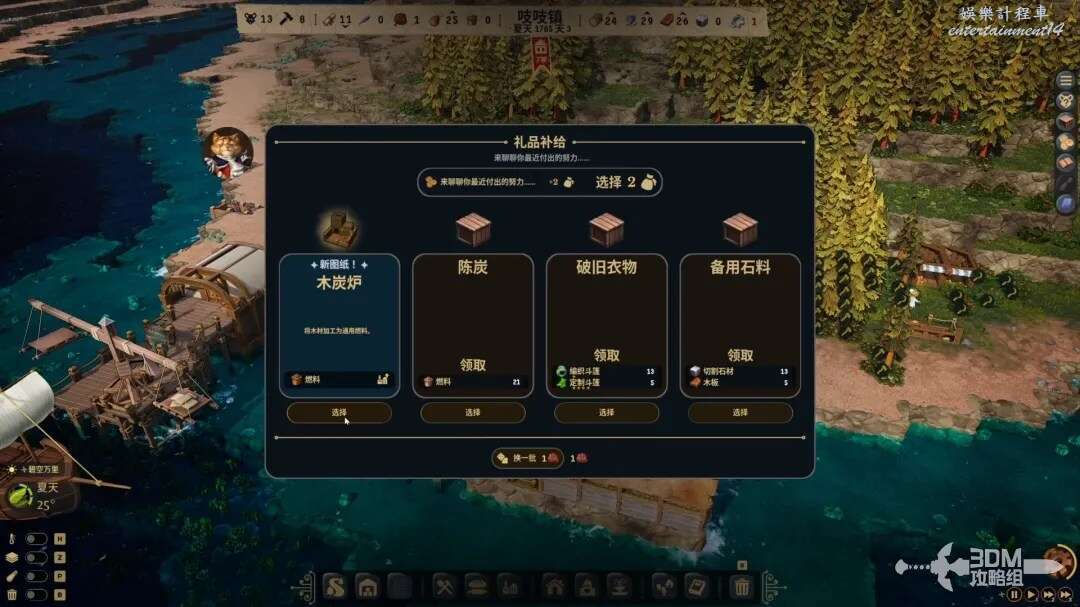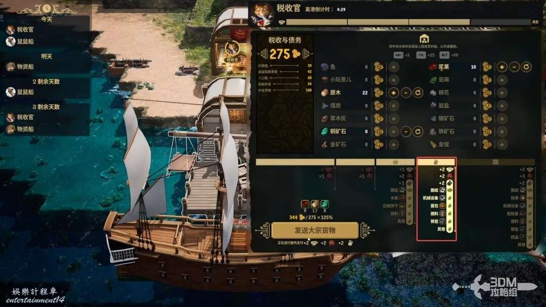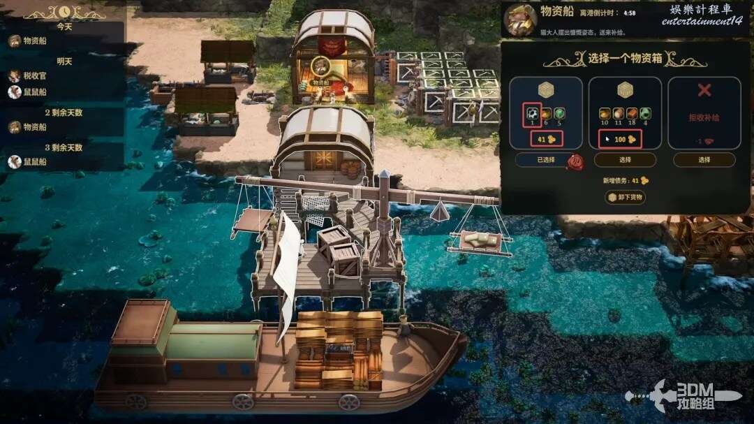 每隔幾天還會有物資船上島,前期選擇有機械設備的物資箱,每個物資箱有不同的價格,稅收官會收取額外的稅。