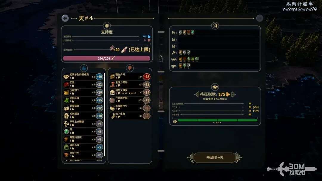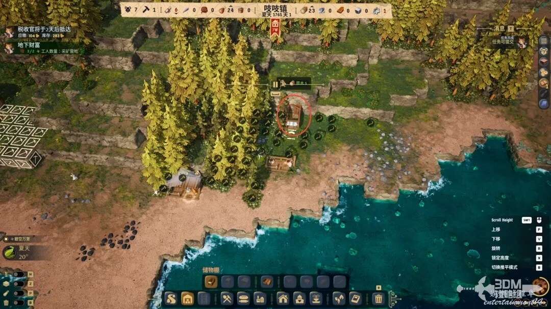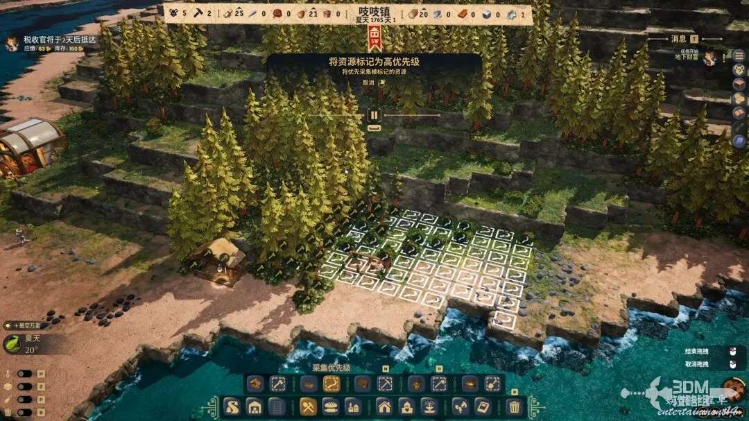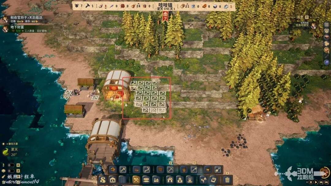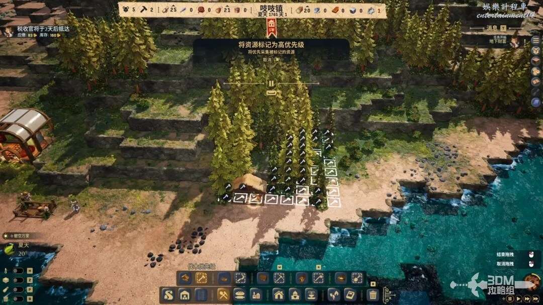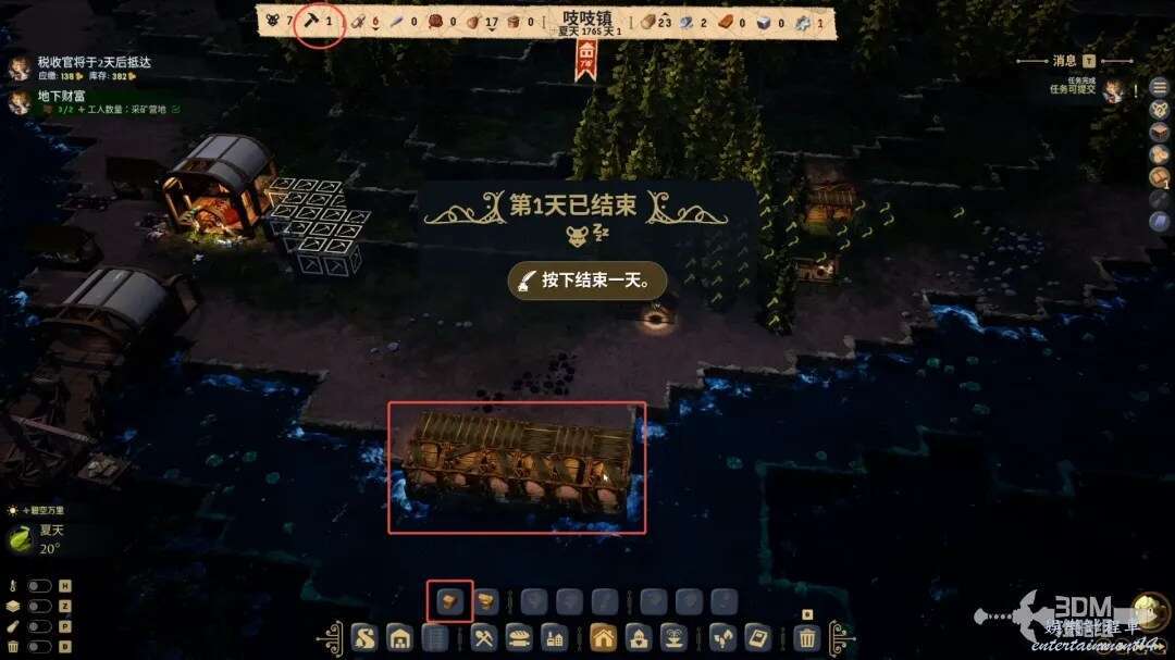 第一天沒有石材資源,無法修建簡單的石頭住所(使用原木建造房子資源不夠),可以安排兩個礦工營地,一個開採礦石資源(用於兩天后的收稅)然後規劃一下之後的發展方向,平整一下土地順便還能收集石頭資源。