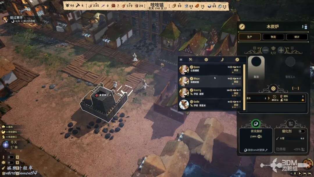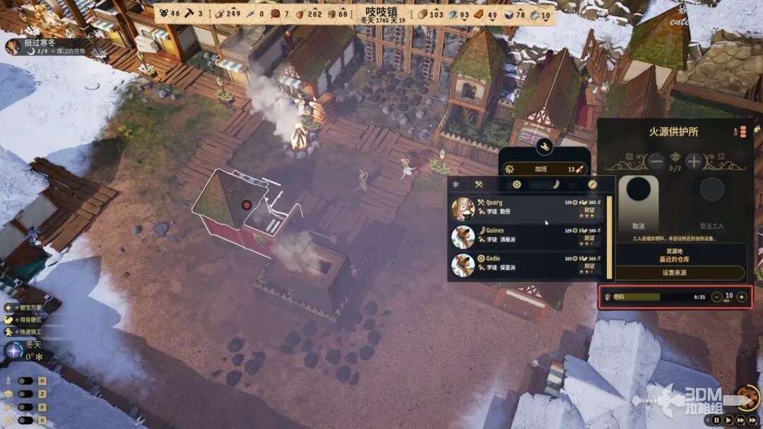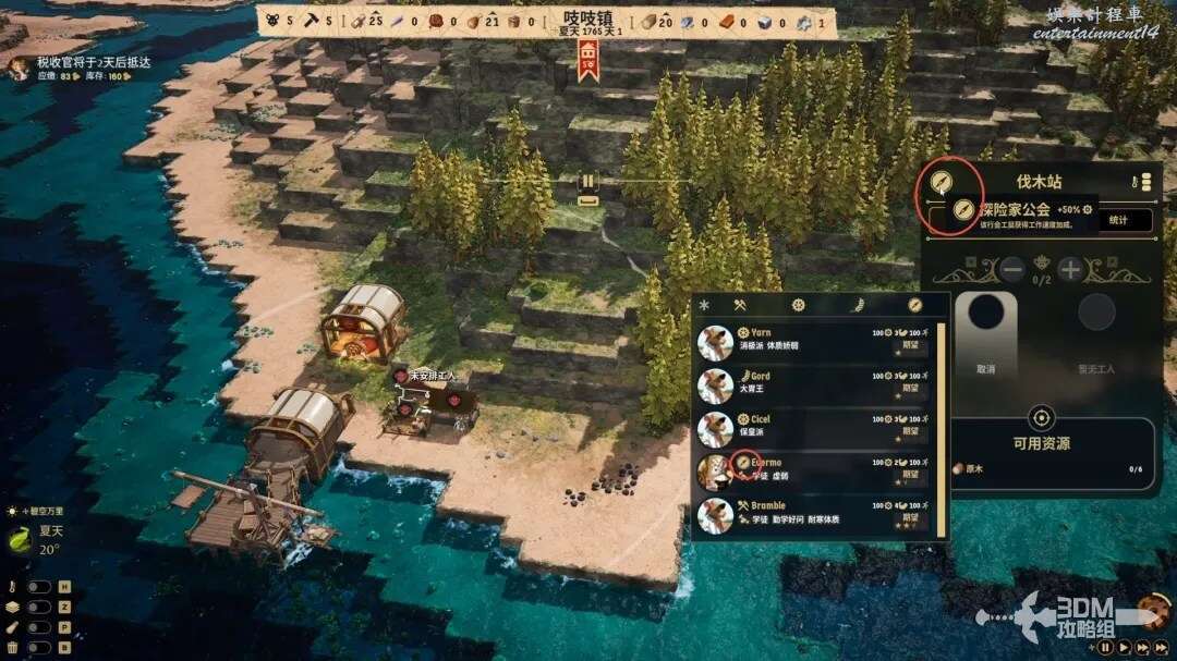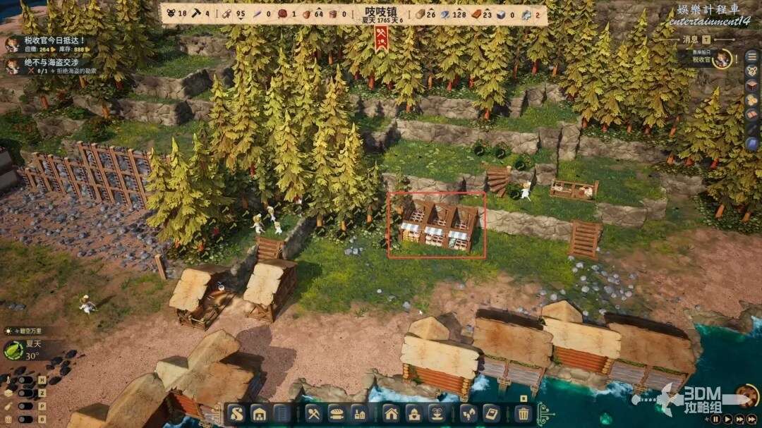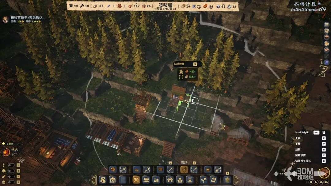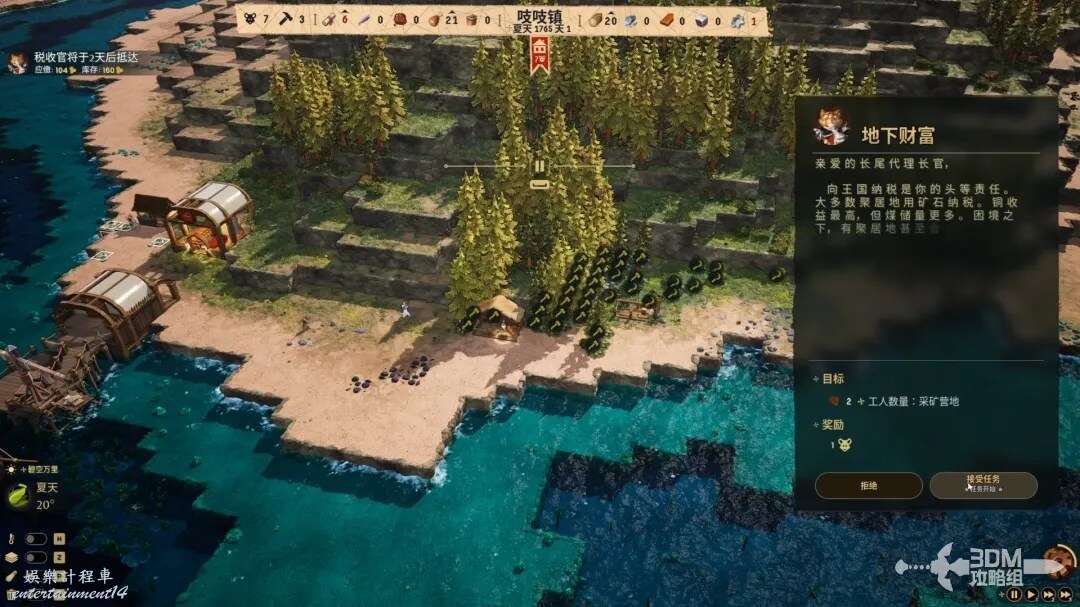 第一天沒有石材資源,無法修建簡單的石頭住所(使用原木建造房子資源不夠),可以安排兩個礦工營地,一個開採礦石資源(用於兩天后的收稅)然後規劃一下之後的發展方向,平整一下土地順便還能收集石頭資源。