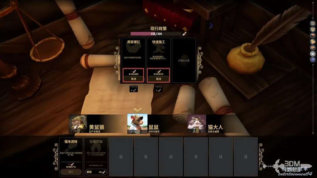 市政廳裡可以選擇政策,需要留意政策的描述,例如用背硬抗,是每一次搬運重物就會消耗一點支持點數;如果還需要使用支持點數引進更多鼠鼠那麼就不要使用政策。