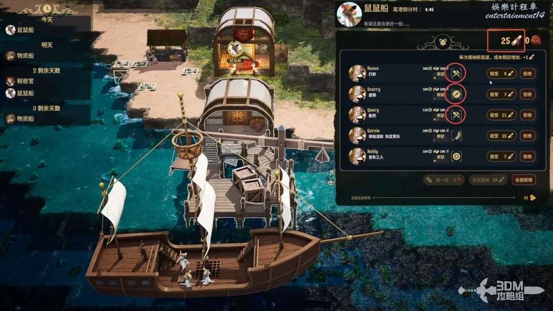 最右邊的船員可以免費刷新,多刷新幾次,篩選一下詞條,最好是有多個帶學徒的鼠鼠,然後一些負面的減益也可以篩選一下。