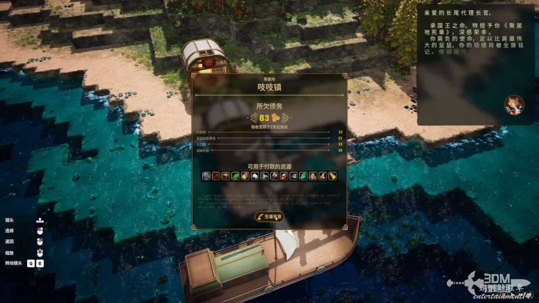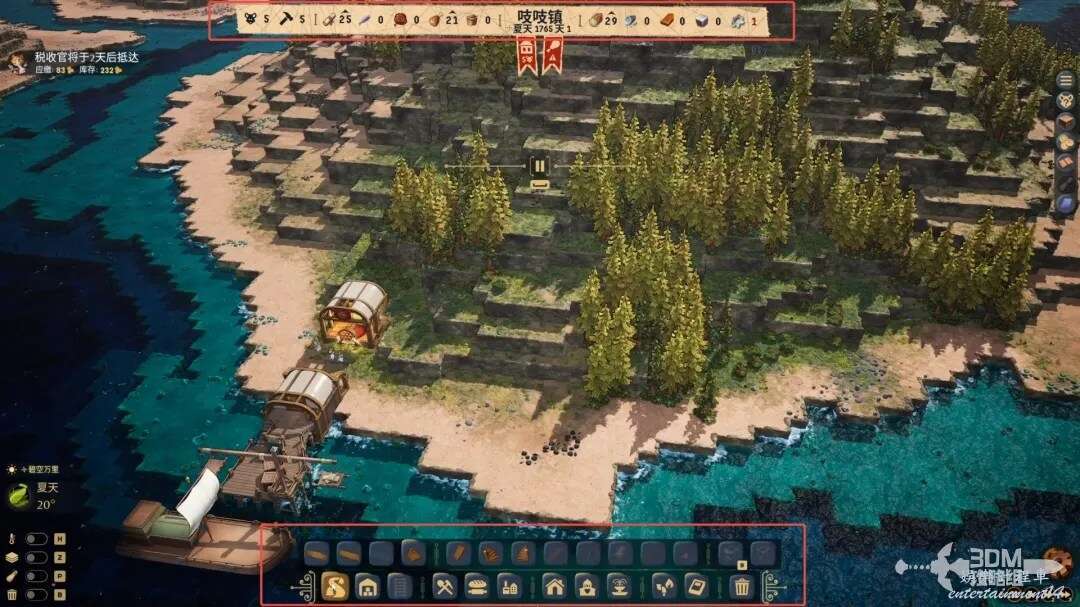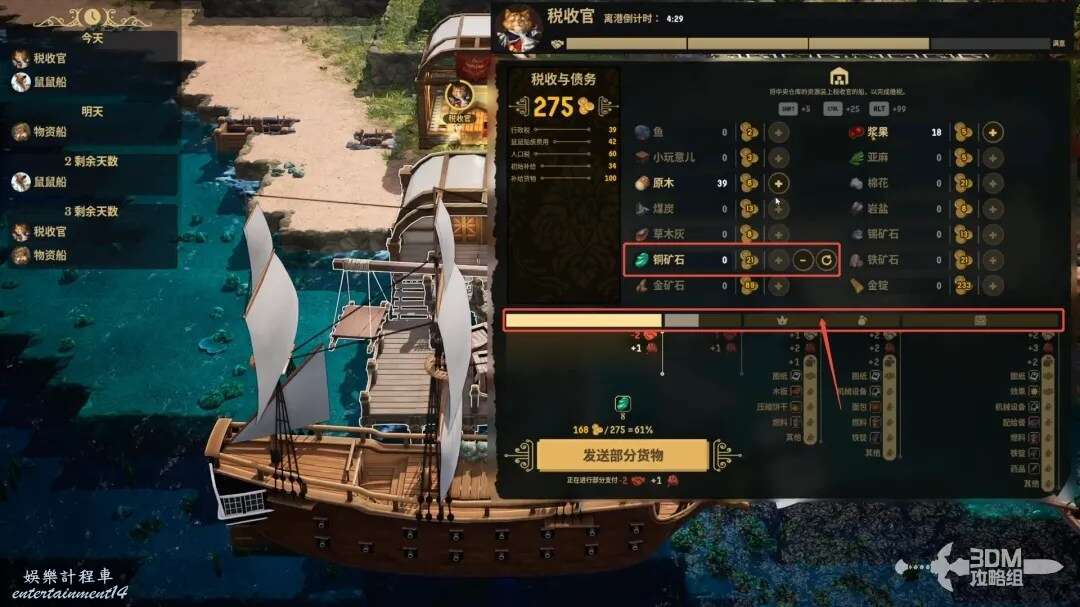 稍後會有物資船前來運送物資,每次接受物資都會欠下一筆債務,每隔幾天都會有收債務的船隻過來收債。玩家需要在這些天內採集島上的資源用來交稅。